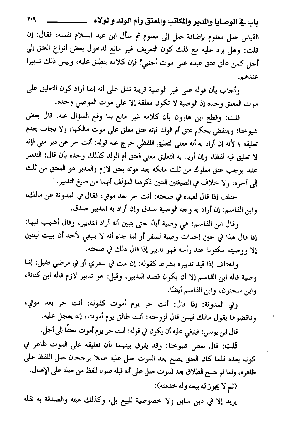 واختلف إذا قيد تدبيره بشرط كقوله: إن مت في سفري أو في مرضي فقيل: إنها وصية قال ابن القاسم إلا أن يكون قصد التدبير، وقيل: هو تدبير لازم قاله ابن كنانة، وابن سحنون، وابن القاسم أيضًا.