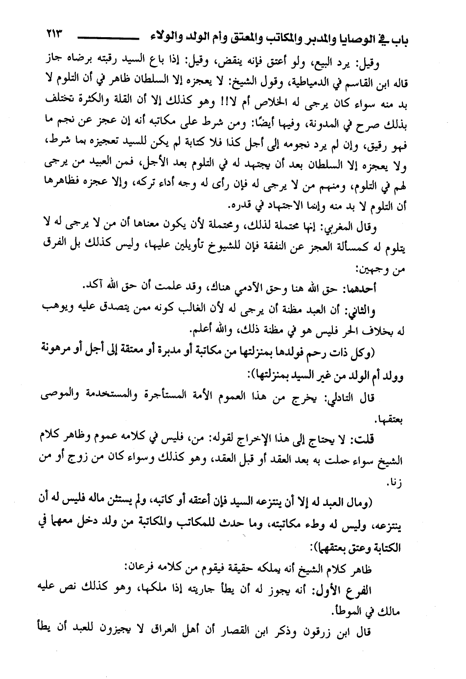 وقيل: يريد البيع، ولو أعتق فإنه ينقض، وقيل: إذا باع السيد رقبته برضاه جاز قاله ابن القاسم في الديماطية، وقول الشيخ: لا يعجزه إلا السلطان ظاهر في أن التلوم لابد منه سواء كان يرجى له الخلاص أم لا!! وهو كذلك إلا أن القلة والكثرة تختلف بذلك صرح في المدونة، وفيها أيضًا: ومن شرط على مكاتبه أنه إن عجز عن نجم ما فهو رقيق، وإن لم يرد نجومه إلى أجل كذا فلا كتابة لم يكن للسيد تعجيزه بما شرط، ولا يعجزه إلا السلطان بعد أن يجتهد له في التلوم بعد الأجل، فمن العبيد من يرجي لهم في التلوم، ومنهم من لا يرجى له فإن رأى له وجه أداء تركه، وإلا عجزه فظاهرها أن التلوم لابد منه وإنما الاجتهاد في قدره.