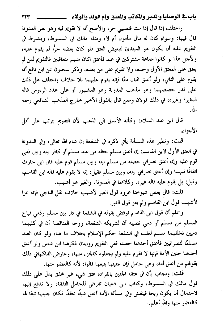 واعلم أن قول ابن القاسم نوقض بقوله في الشفعة في دار بين مسلم وذمي فباع المسلم من مسلم أو ذمي نصيبه أن لشريكه الشفعة، ووجه المناقضة أن في كليهما ... ذميين تخللهما مسلم لغلب في الشفعة حكم الإسلام بخلاف ما هنا، ولو كان العبد مسلمًا لنصرانيين فأعتق أحدهما حصته ففي التقويم روايتان ذكرهما ابن شاس ولو أعتق أحدهما جنين الأمة فإنها لا تقوم عليه ولم يجعلوه كالجزء منها، وعارض الفاكهاني ذلك بقولهم من أعتق أمة، وهي حامل فإن جنينها يتبعها قالوا: لأنه كالعضو منها.