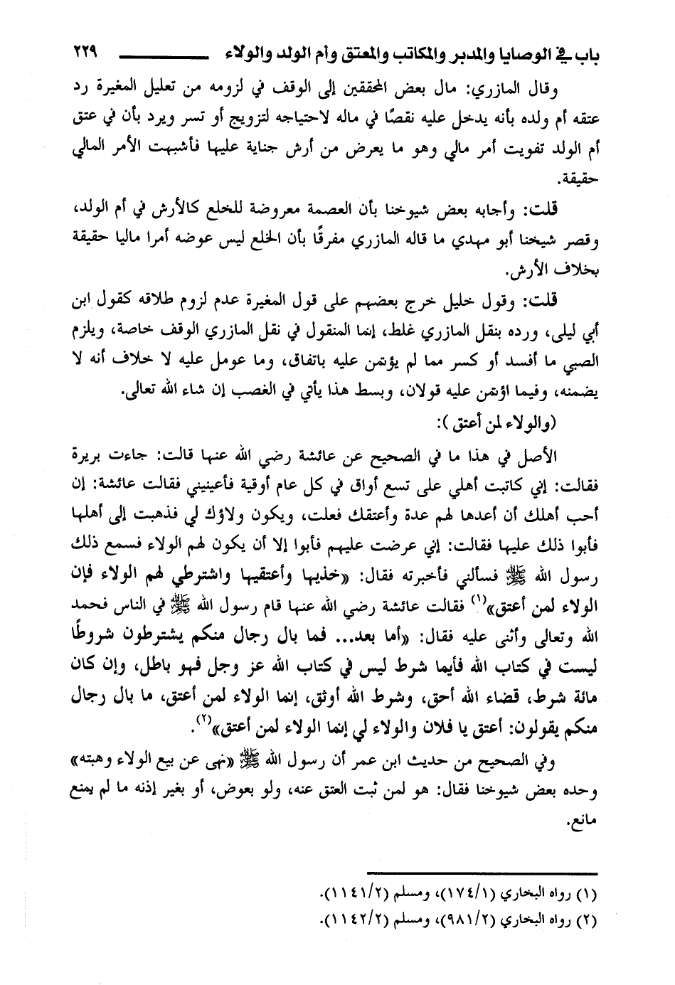وقال المازري: مال بعض المحققين إلى الوقف في لزومه من تعليل المغيرة رد عتقه أم ولده بأنه يدخل عليه نقصًا في ماله لاحتياجه لتزويج أو تسر ويرد بأن في عتق أم الولد تفويت أمر مالي وهو ما يعرض من أرش جناية عليها فأشبهت الأمر المالي حقيقة.