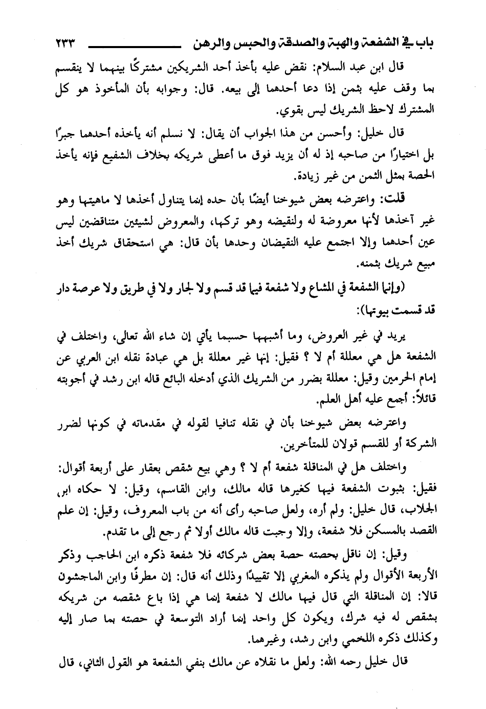 قال خليل الله: ولعل ما نقلاه عن مالك بنفي الشفعة هو القول الثاني، قال