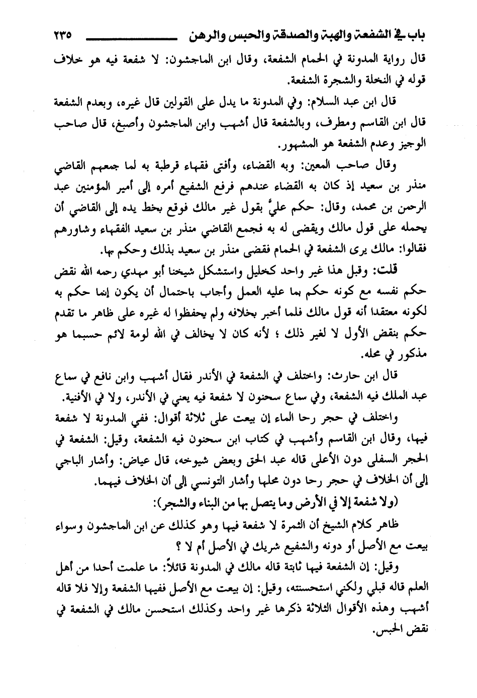وقال صاحب المعين: وبه القضاء، وأفتى فقهاء قرطبة به لما جمعهم القاضي منذر بن سعيد إذ كان به القضاء عندهم فرفع الشفيع أمره إلى أمير المؤمنين عبد الرحمن بن محمد، وقال: حكم عبى بقول غير مالك فوقع بخط يده إلى القاضي أن يحمله على قول مالك ويقضي له به فجمع القاضي منذر بن سعيد الفقهاء وشاورهم فقالوا: مالك يرى الشفعة في الحمام فقضي منذر بن سعيد بذلك وحكم بها.