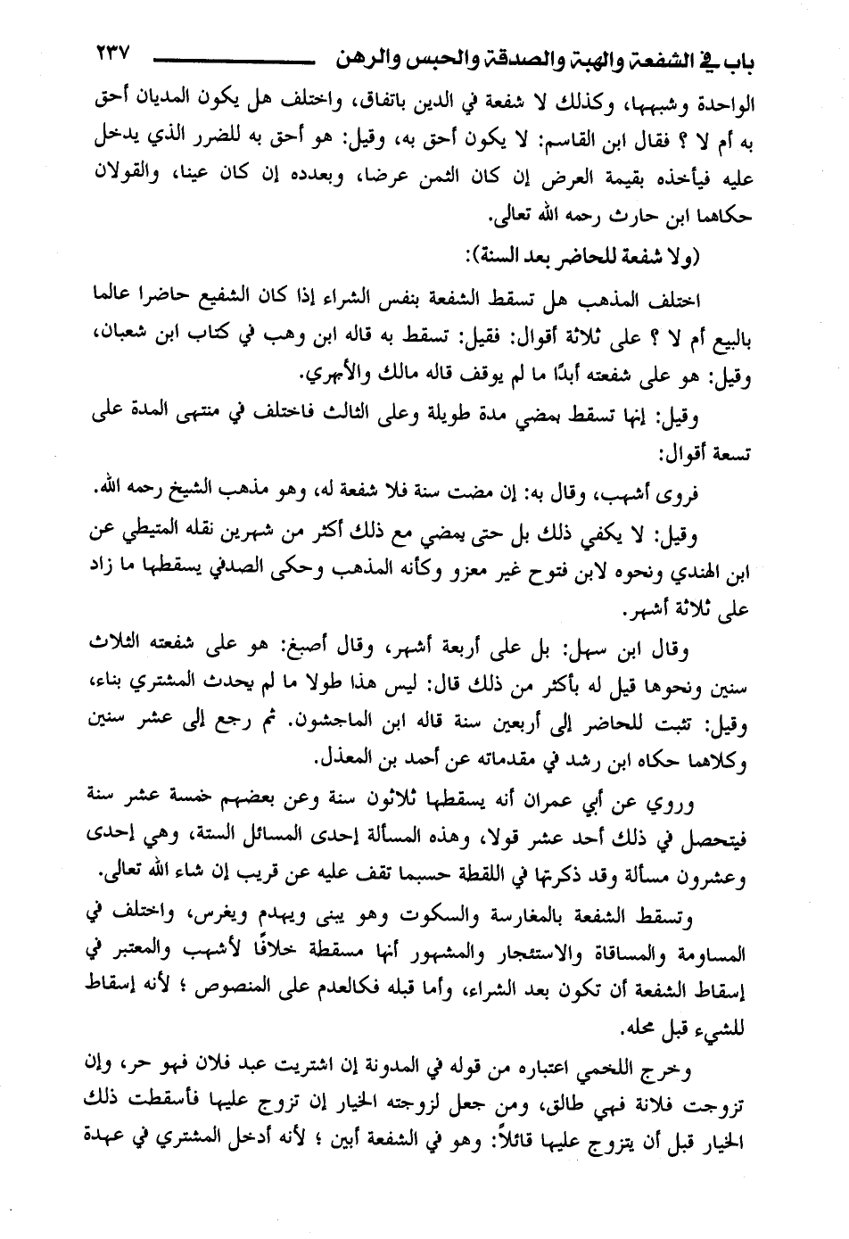 وقال ابن سهل: بل على أربعة أشهر، وقال أصبغ: وهو على شفعته الثلاث سنين ونحوها قيل له بأكثر من ذلك قال: ليس هذا طولا ما لم يحدث المشتري بناء، وقيل: تثبت للحاضر إلى أربعين سنة قاله ابن الماجشون. ثم رجع إلى عشر سنين وكلاهما حكاه ابن رشد في مقدماته عن أحمد بن المعذل.