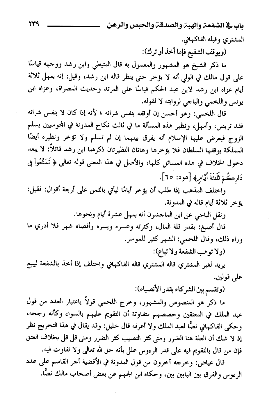 قال اللخمي: وهو أحسن إن أوقفه بنفس شرائه؛ لأنه إذا كان لا بنفس شرائه فقد تربص، وأمهل، ونظير هذه المسألة ما في ثالث نكاح المدونة وفي المجوسيين يسلم الزوج فيعرض عليها الإسلام أنه يفرق بينهما إن لم تسلم ولو تؤخر ونظيره أيضًا المملكة يوقفها السلطان فلا يؤخرها وهاتان النظيرتان ذكرهما ابن رشد قائلاً: لا يبعد دخول الخلاف في هذه المسائل كلها، والأصل في هذا المعنى قوله تعالى (تمتعوا في داركم ثلاثة أيام) [هود: 65].