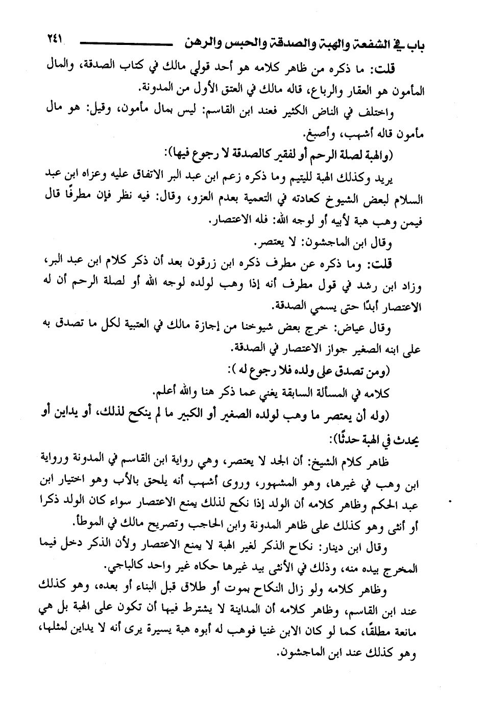 قلت: وما ذكره عن مطرف ذكره ابن زرقون بعد أن ذكر كلام ابن عبد البر، وزاد ابن رشد في قول مطرف أنه إذا وهب لولده لوجه الله أو لصلة الرحم أن له الاعتصار أبدًا حتى يسمي الصدقة.