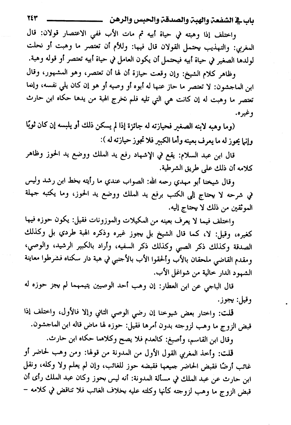 واختلف فيما لا يعرف بعينه من المكيلات والموزونات فقيل: يكون حوزه فيها كغيره، وقيل: لا، كما قال الشيخ بل يجوز غيره وذكره الهبة طردي بل وكذلك الصدقة وكذلك ذكر الصبي وكذلك ذكر السفيه، وأراد بالكبير الرشيد، والوصي، ومقدم القاضي ملحقان بالأب وألحقوا الأب بالأجنبي في هبة دار سكناه فشرطوا معاينة الشهود الدار خالية من شواغل الأب.