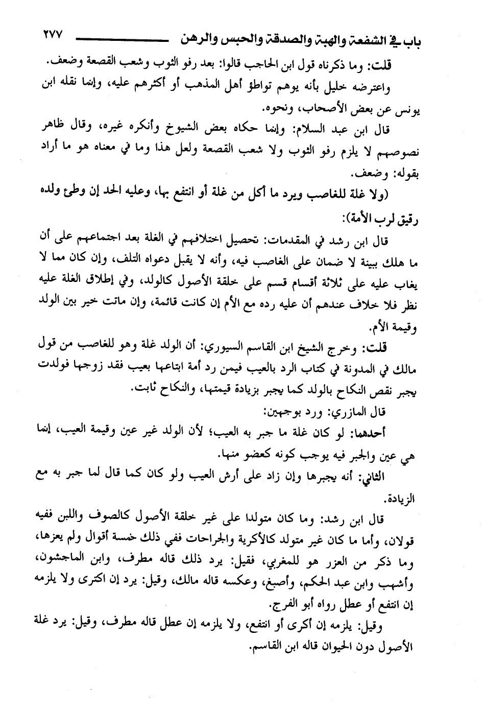 قال ابن رشد في المقدمات: تحصيل اختلافهم في الغلة بعد اجتماعهم على أن ما هلك ببينة لا ضمان على الغاصب فيه، وأنه لا يقبل دعواه التلف، وإن كان مما لا يغاب عليه على ثلاثة أقسام قسم على خلقه الأصول كالولد، وفي إطلاق الغلة عليه نظر فلا خلاف عندهم أن عليه رده مع الأم إن كانت قائمة، وإن ماتت خير بين الولد وقيمة الأم.