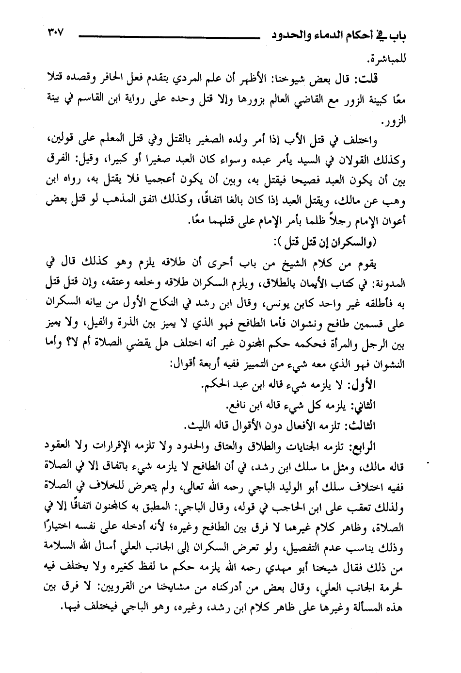 الرابع: تلزمه الجنايات والطلاق والعتاق والحدود ولا تلزمه الإقرارات ولا العقود قاله مالك، ومثل له سلك ابن رشد، في أن الطافح لا يلزمه شيء باتفاق إلا في الصلاة ففيه اختلاف سلك أبو الوليد الباجي رحمه الله تعالى، ولم يتعرض للخلاف في الصلاة ولذلك تعقب على ابن الحاجب في قوله، وقال الباجي: المطبق به كالمجنون اتفاقًا إلا في الصلاة، وظاهر كلام غيرهما لا فرق بين الطافح وغيره؛ لأنه أدخله على نفسه اختيارًا وذلك يناسب عدم التفصيل، ولو تعرض السكران إلى الجانب العلي أسال الله السلامة من ذلك فقال شيخنا أبو مهدي رحمه الله يلزمه حكم ما لفظ كغيره ولا يختلف فيه لحرمة الجانب العلي، وقال بعض من أدركناه من مشايخنا من القرويين: لا فرق بين هذه المسألة وغيرها على ظاهر كلام ابن رشد، وغيره، وهو الباجي فيختلف فيها.