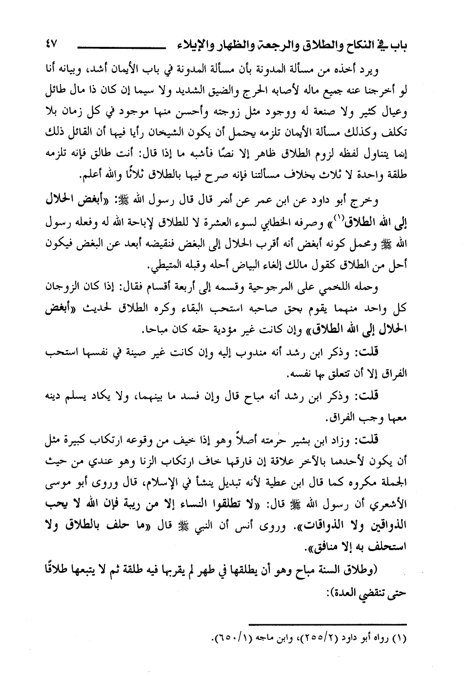 وخرج أبو داود عن ابن عمر عن أنمر قال قال رسول الله (صلى الله عليه وسلم): أبغض الحلال إلى الله الطلاق" وصرفه الخطابي لسوء العشرة لا للطلاق لإباحة الله له وفعله رسول الله (صلى الله عليه وسلم) ومحمل كونه أبغض فيكون أحل من الطلاق كقول مالك إلغاء البياض أحله وقبله المتيطي.