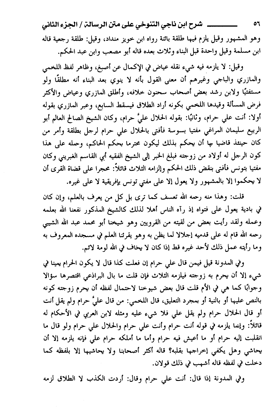 وقيل: لا يلزمه فيه شيء نقله عياض في الإكمال عن أصبغ، وظاهر لفظ اللخمي والمازري والباجي وغيرهم أن معني القول بأنه لا ينوي بعد البناء أنه مطلقا ولو مستفتيا ولابن رشد بعض أصحاب سحنون خلافه، وأطلق المازري وعياض والأكثر فرض المسألة وقيدها اللخمي بكونه أراد الطلاق فيسقط السابع، وعبر المازري بقوله أولا: أنت على حرام، وثانيا: بقوله الحلال على حرام، وكان الشيخ الصالح العالم أبو الربيع سليمان المراغي مفتيا بسوسة فأفتى بالحلال على حرام لرجل بطلقة وأمر من كان حينئذ قاضيا بها أن يحكم بذلك ليكون محترما بحكم الحاكم، وحمله على هذا كون الرجل له أولاد من زوجته فبلغ الخبر إلى الشيخ الفقيه أبي القاسم الغبريني وكان مفتيا بتونس فأفتي بنقض ذلك الحكم وإلزامه الثلاث قائلاً: محجرا على قضاة القرى أن لا يحكموا إلا بالمشهور ولا يعول إلا على مفتي تونس بإفريقية لا على غيره.