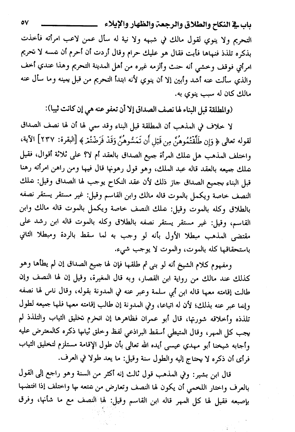 الآية، واختلف المذهب هل تملك المرأة جميع الصداق بالعقد أم لا؟ على ثلاثة أقوال، فقيل تملك جمعيه بالعقد قاله عبد الملك، وهو قول رهونها قال فيها ومن راهن امرأته رهنا قبل البناء بجميع الصداق جاز ذلك لأن عقد النكاح يوجب لها الصداق وقيل: تملك النصف خاصة ويكمل بالموت قاله مالك وابن القاسم وقيل: غير مستقر يستقر نصفه بالطلاق وكله بالموت وقيل: تملك النصف خاصة ويكمل بالموت قاله مالك وابن القاسم، وقيل: غير مستقر يستقر نصفه بالطلاق وكله بالموت قاله ابن رشد على مقتضي المذهب مبطلا الأول بأنه لو وجب به لما سقط بالردة ومبطلا الثاني باستحقاقها كله بالموت، والموت لا يوجب شيء.