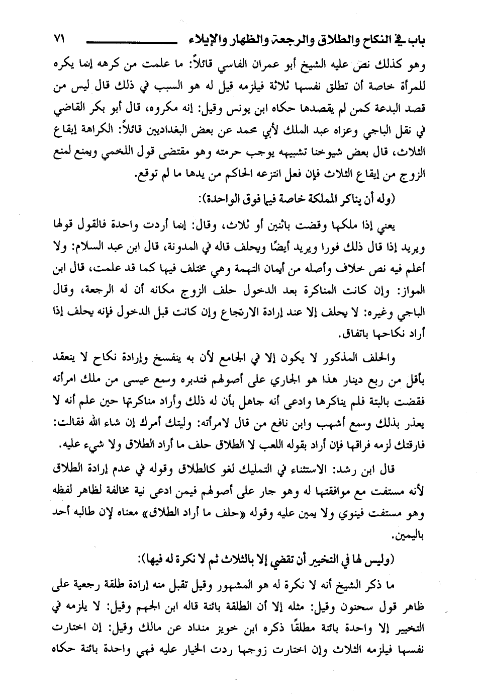 يعني إذا ملكها وقضت باثنين أو ثلاث، وقال: إنما أردت واحدة فالقول قولها ويريد إذا قال ذلك فورا ويريد أيضا يحلف قاله في المدونة، قال ابن عبد السلام: ولا أعلم فيه نص خلاف وأصله من أيمان التهمة وهي مختلف فيما كما قد علمت، قال ابن المواز: وإن كانت المناكرة بعد الدخول حلف الزوج مكانه أن له الرجعة، وقال الباجي وغيره: لا يحلف إلا عند إراره الارتجاع وإن كانت قبل الدخول فإنه يحلف إذا أراد نكاحها باتفاق.