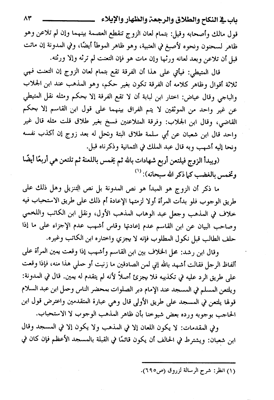 وقال ابن رشد: محل الخلاف بين ابن القاسم وأشهب إذا وقعت يمين المرأة على ألفاظ الرجل فقالت أشهد بالله إني لمن الصادقين ما زنيت أو حملي هذا منه، فإذا وقعت على طريق الرد عليه في تكذيبه فلا يجزئ أصلاً لأنه لم يتقدم له يمين. قال في المدونة: ويلتعن المسلم في المسجد على طريق الأولى قال وهي عبارة المتقدمين واعتراض قول ابن الحاجب بوجوبه ورده بعض شيوخنا بأن ظاهر المذهب الوجوب لا الاستحباب.