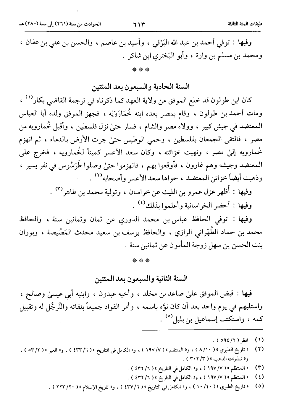 (2) «تاريخ الطبري» (10/ 8)، و «المنتظم» (7/ 197)، و «الكامل في التاريخ» (6/ 433)، و «العبر» (2/ 53)، و «شذرات الذهب» (3/ 302).