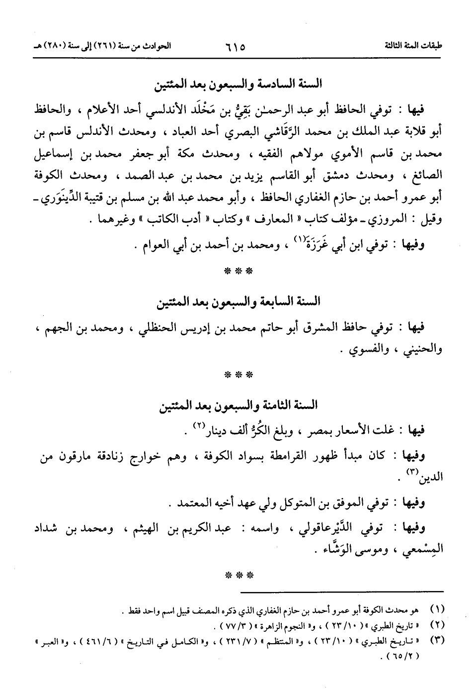 (3) «تاريخ الطبري» (10/ 23)، و «المنتظم» (7/ 231)، و «الكامل في التاريخ» (6/ 461)، و «العبر» (2/ 65).