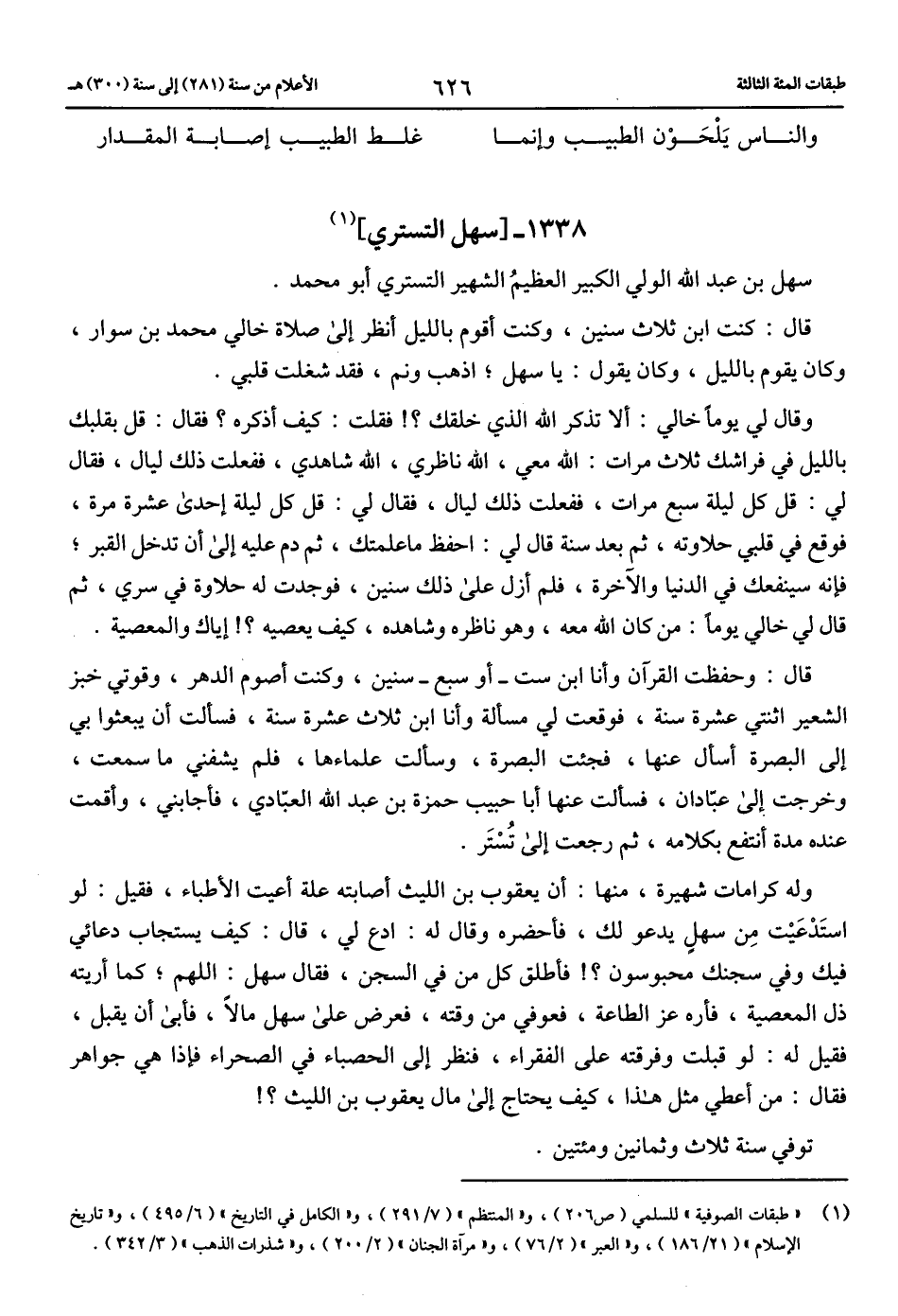 سهل بن عبد الله الولي الكبير العظيم الشهير التستري أبو محمد.