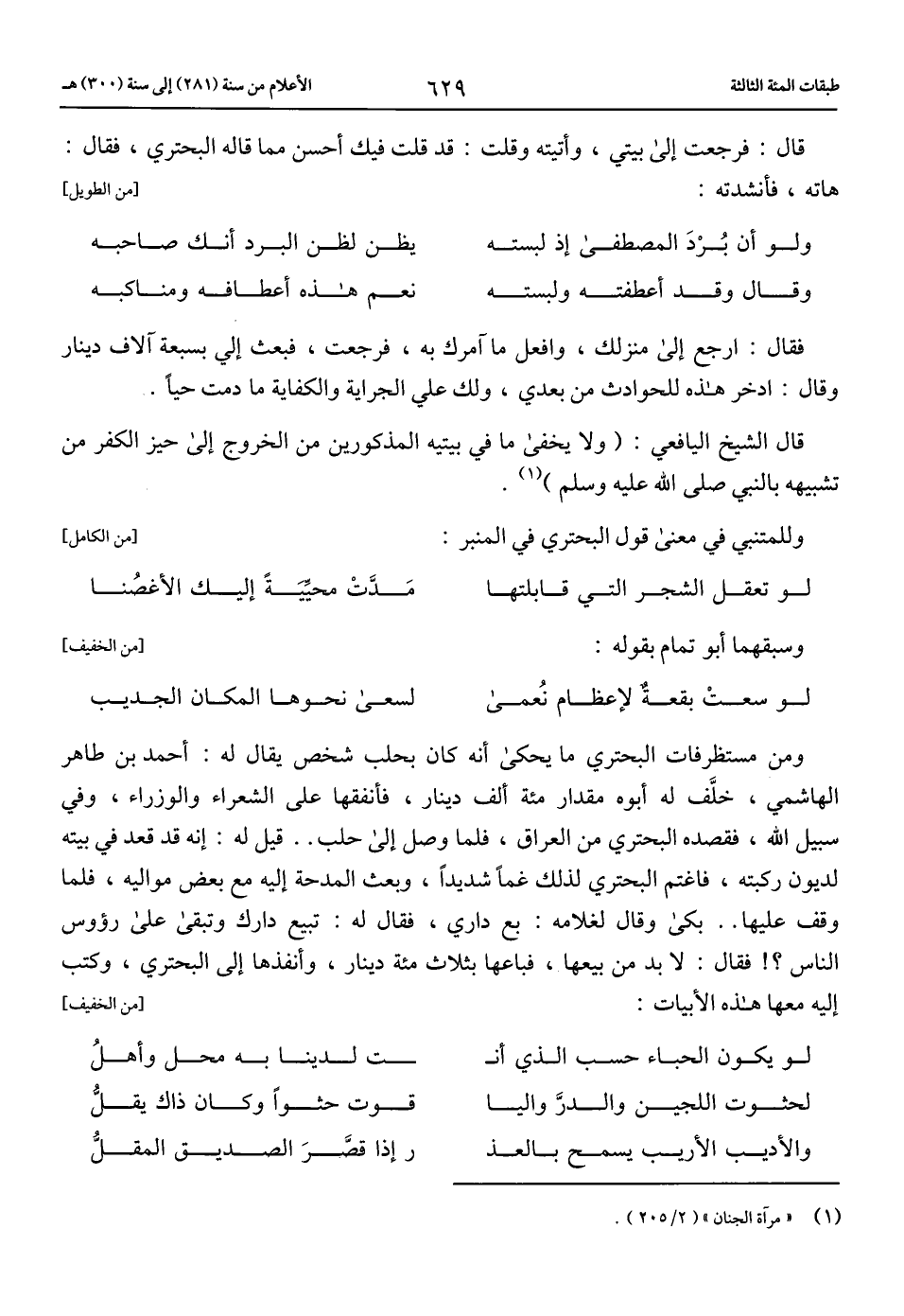 ومن مستظرفات البحتري ما يحكى أنه كان بحلب شخص يقال له: أحمد بن طاهر الهاشمي، خلّف له أبوه مقدار مائة ألف دينار، فأنفقها على الشعراء والوزراء، وفي سبيل الله، فقصده البحتري من العراق، فلما وصل إلى حلب .. قيل له: إنه قد قعد في بيته لديون ركبته، فاغتم البحتري لذلك غما شديدا، وبعث المدحة إليه مع بعض مواليه، فلما وقف عليها .. بكى وقال لغلامه: بع داري، فقال له: تبيع دارك وتبقى على رءوس الناس؟ ! فقال: لا بد من بيعها، فباعها بثلاث مائة دينار، وأنفذها إلى البحتري، وكتب إليه معها هذه الأبيات: [من الخفيف]
