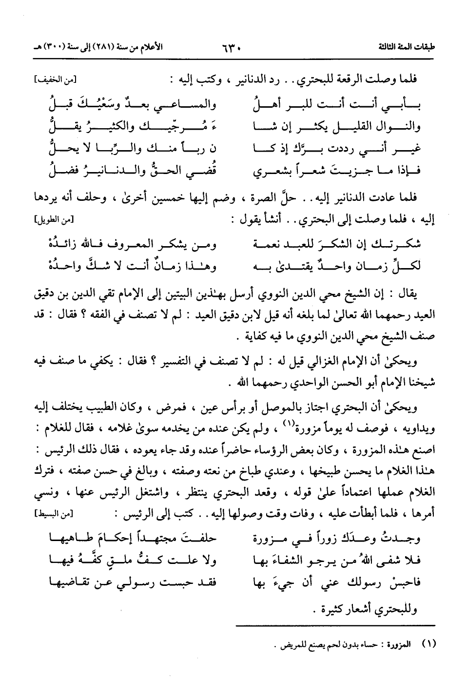 ويحكى أن البحتري اجتاز بالموصل أو برأس عين، فمرض، وكان الطبيب يختلف إليه ويداويه، فوصف له يوما مزورة (1)، ولم يكن عنده من يخدمه سوى غلامه، فقال للغلام: