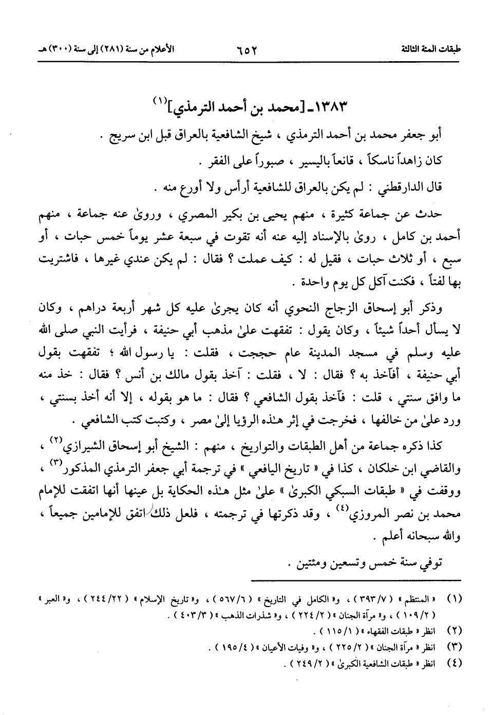 كذا ذكره جماعة من أهل الطبقات والتواريخ، منهم: الشيخ أبو إسحاق الشيرازي (2)، والقاضي ابن خلكان، كذا في «تاريخ اليافعي» في ترجمة أبي جعفر الترمذي المذكور (3)، ووقفت في «طبقات السبكي الكبرى» على مثل هذه الحكاية بل عينها أنها اتفقت للإمام محمد بن نصر المروزي (4)، وقد ذكرتها في ترجمته، فلعل ذلك اتفق للإمامين جميعا، والله سبحانه أعلم.