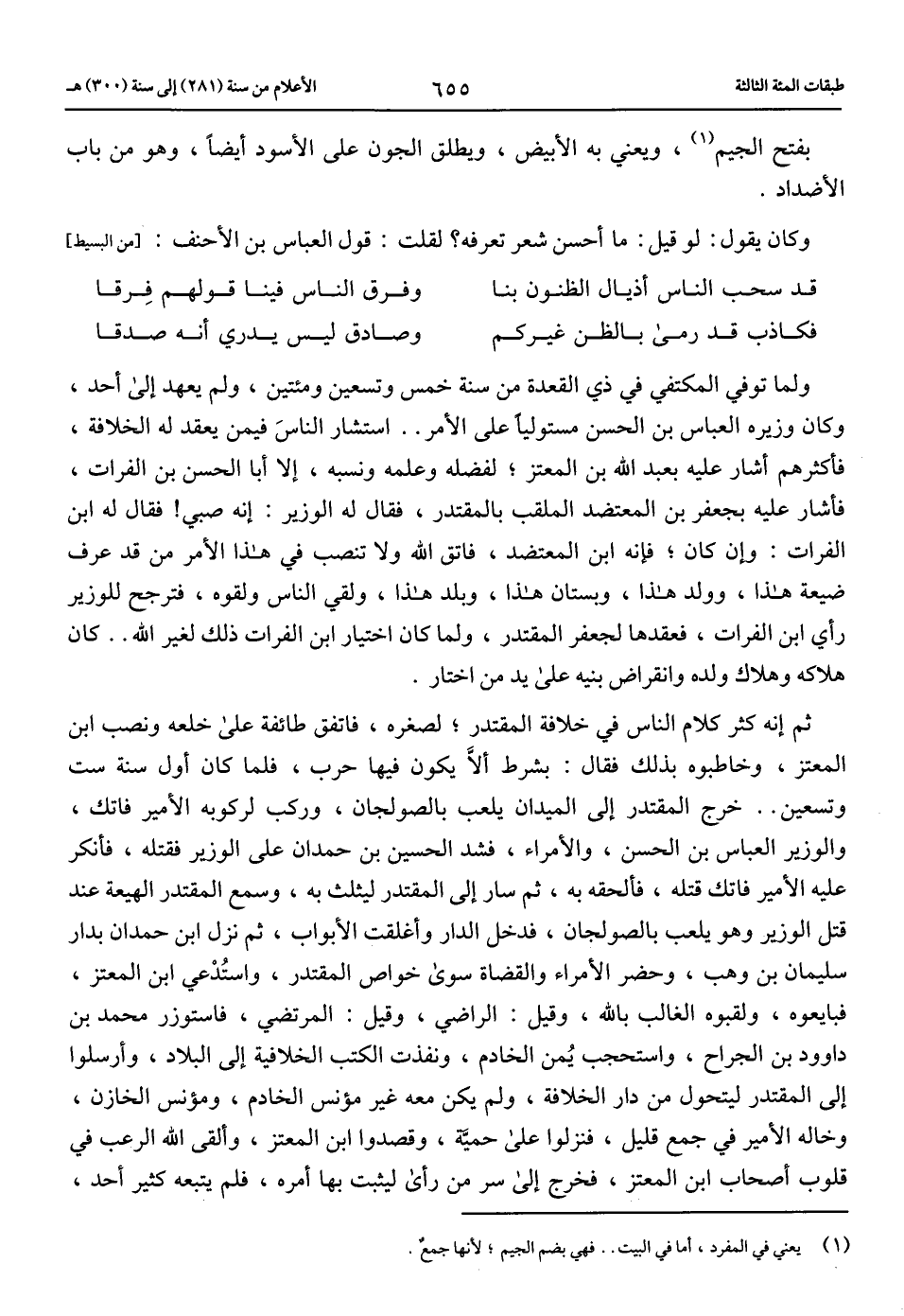 ولما توفي المكتفي في ذي القعدة من سنة خمس وتسعين ومائتين، ولم يعهد إلى أحد، وكان وزيره العباس بن الحسن مستوليا على الأمر .. استشار الناس فيمن يعقد له الخلافة، فأكثرهم أشار عليه بعبد الله بن المعتز؛ لفضله وعلمه ونسبه، إلا أبا الحسن بن الفرات، فأشار عليه بجعفر بن المعتضد الملقب بالمقتدر، فقال له الوزير: إنه صبي! فقال له ابن الفرات: وإن كان؛ فإنه ابن المعتضد، فاتق الله ولا تنصب في هذا الأمر من قد عرف ضيعة هذا، وولد هذا، وبستان هذا، وبلد هذا، ولقي الناس ولقوه، فترجح للوزير رأي ابن الفرات، فعقدها لجعفر المقتدر، ولما كان اختيار ابن الفرات ذلك لغير الله .. كان هلاكه وهلاك ولده وانقراض بنيه على يد من اختار.