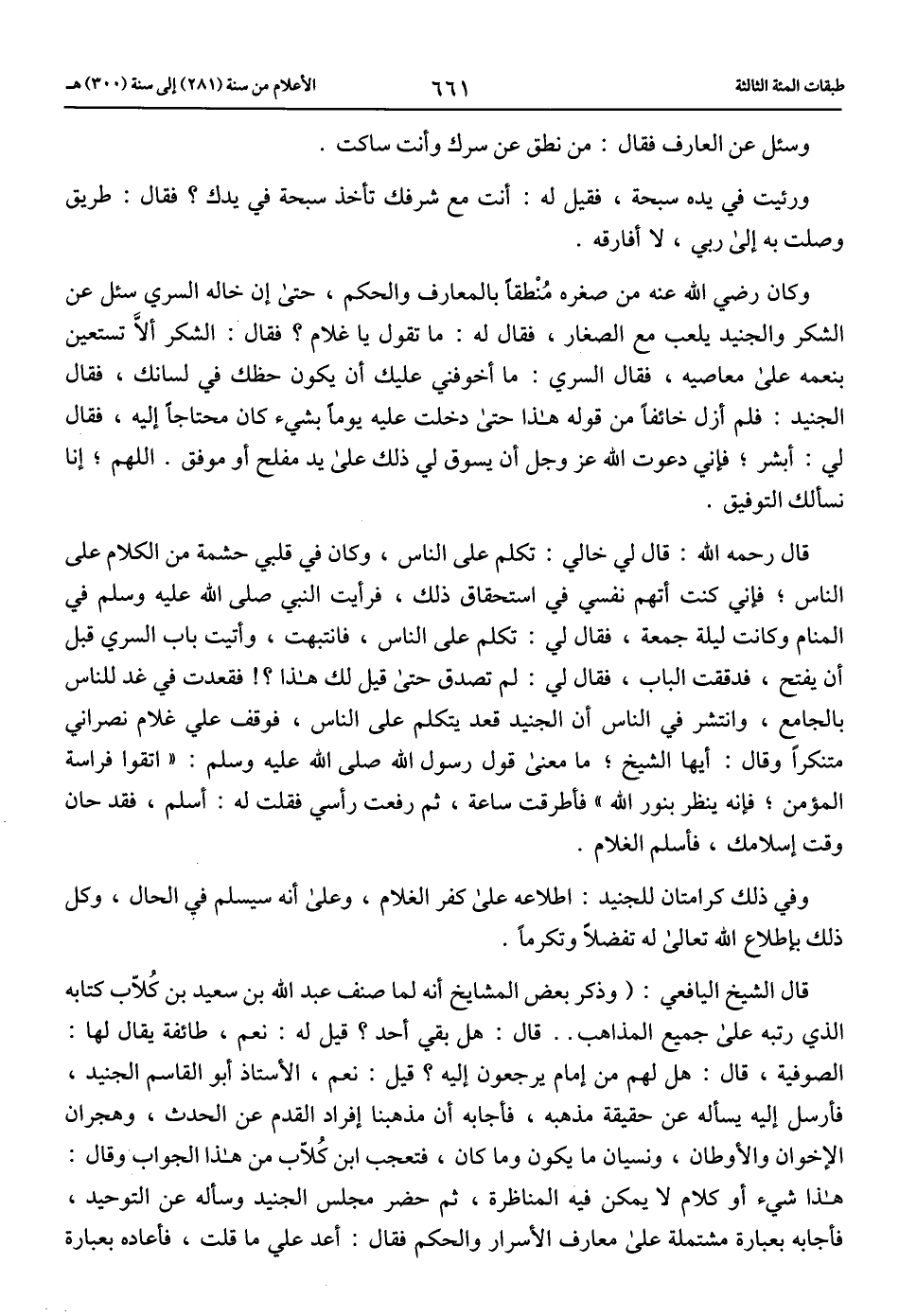 الصوفية، قال: هل لهم من إمام يرجعون إليه؟ قيل: نعم، الأستاذ أبو القاسم الجنيد، فأرسل إليه يسأله عن حقيقة مذهبه، فأجابه أن مذهبنا إفراد القدم عن الحدث، وهجران الإخوان والأوطان، ونسيان ما يكون وما كان، فتعجب ابن كلاّب من هذا الجواب وقال: