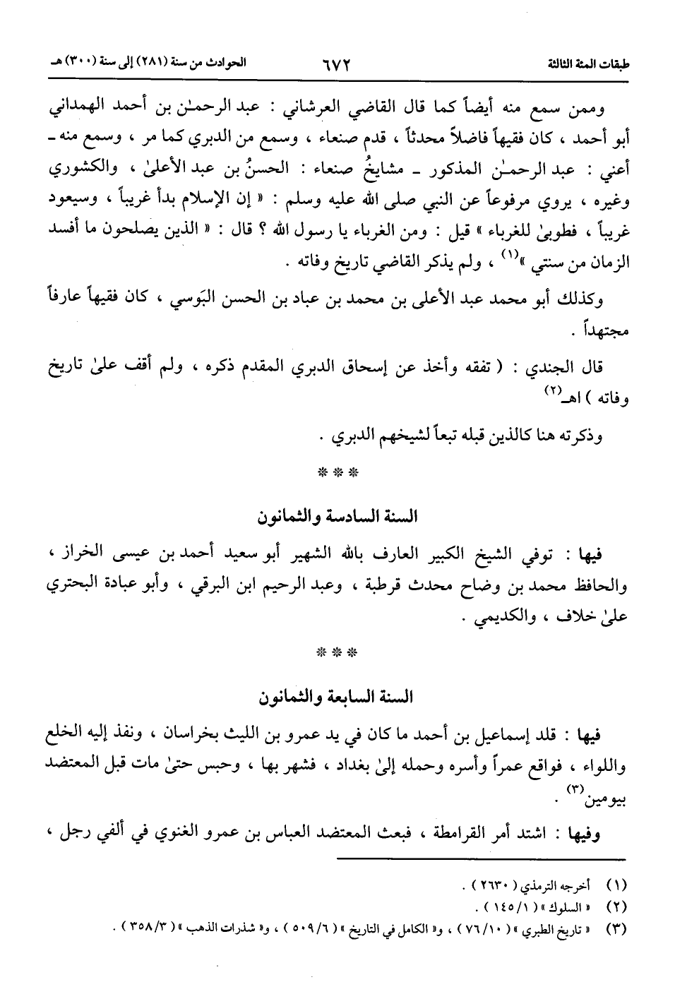 وممن سمع منه أيضا كما قال القاضي العرشاني: عبد الرحمن بن أحمد الهمداني أبو أحمد، كان فقيها فاضلا محدثا، قدم صنعاء، وسمع من الدبري كما مر، وسمع منه- أعني: عبد الرحمن المذكور-مشايخ صنعاء: الحسن بن عبد الأعلى، والكشوري وغيره، يروي مرفوعا عن النبي صلّى الله عليه وسلم: «إن الإسلام بدأ غريبا، وسيعود غريبا، فطوبى للغرباء» قيل: ومن الغرباء يا رسول الله؟ قال: «الذين يصلحون ما أفسد الزمان من سنتي» (1)، ولم يذكر القاضي تاريخ وفاته.