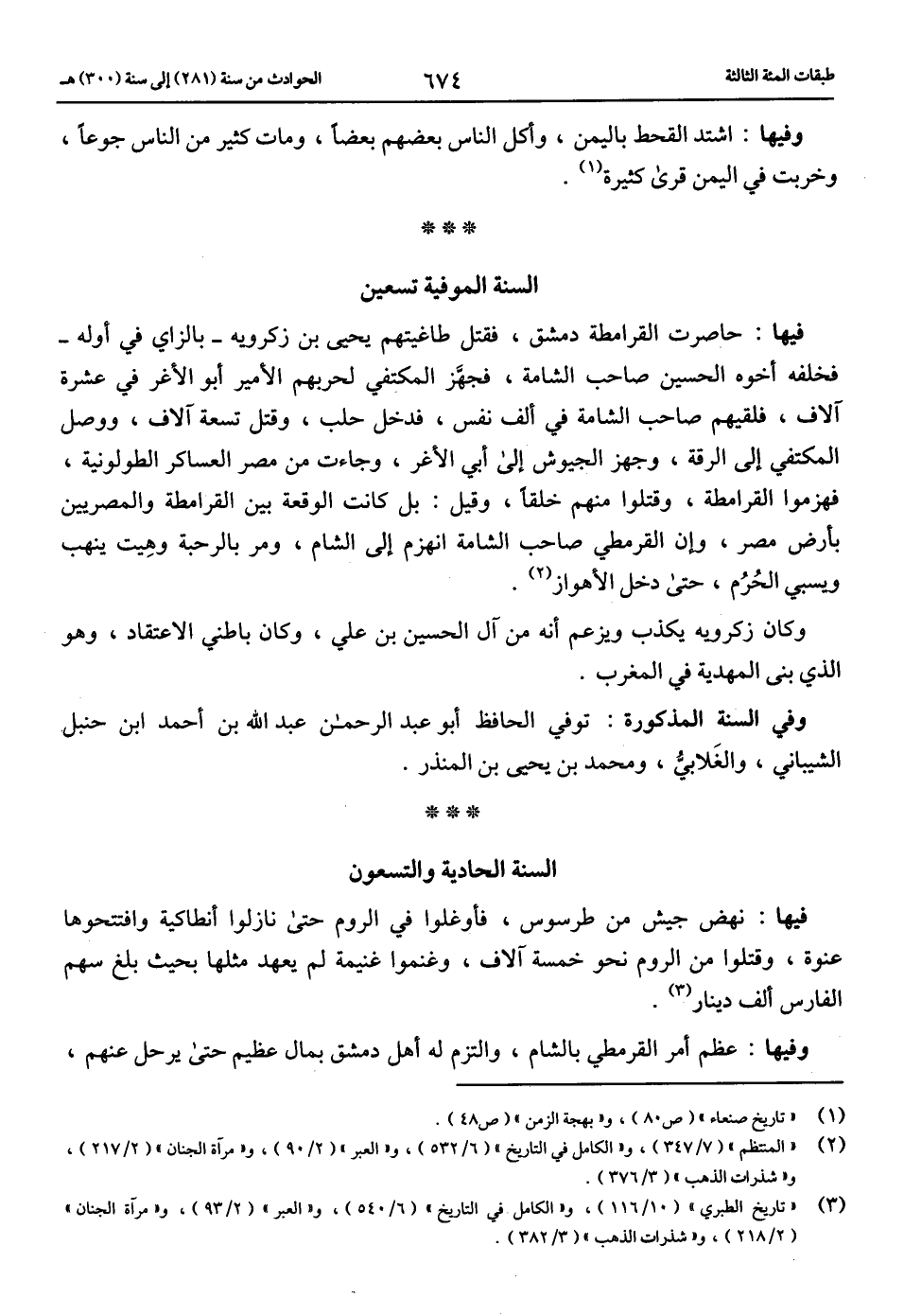 فيها: حاصرت القرامطة دمشق، فقتل طاغيتهم يحيى بن زكرويه-بالزاي في أوله- فخلفه أخوه الحسين صاحب الشامة، فجهّز المكتفي لحربهم الأمير أبو الأغر في عشرة آلاف، فلقيهم صاحب الشامة في ألف نفس، فدخل حلب، وقتل تسعة آلاف، ووصل المكتفي إلى الرقة، وجهز الجيوش إلى أبي الأغر، وجاءت من مصر العساكر الطولونية، فهزموا القرامطة، وقتلوا منهم خلقا، وقيل: بل كانت الوقعة بين القرامطة والمصريين بأرض مصر، وإن القرمطي صاحب الشامة انهزم إلى الشام، ومر بالرحبة وهيت ينهب ويسبي الحرم، حتى دخل الأهواز (2).