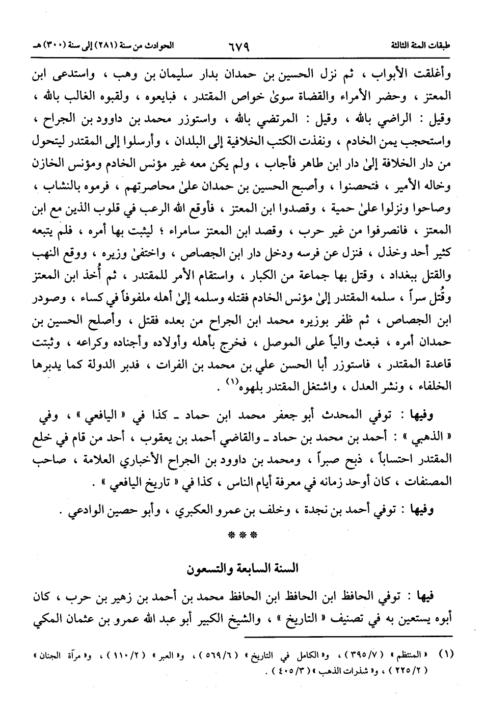 وفيها: توفي المحدث أبو جعفر محمد ابن حماد-كذا في «اليافعي»، وفي «الذهبي»: أحمد بن محمد بن حماد-والقاضي أحمد بن يعقوب، أحد من قام في خلع المقتدر احتسابا، ذبح صبرا، ومحمد بن داود بن الجراح الأخباري العلامة، صاحب المصنفات، كان أوحد زمانه في معرفة أيام الناس، كذا في «تاريخ اليافعي».