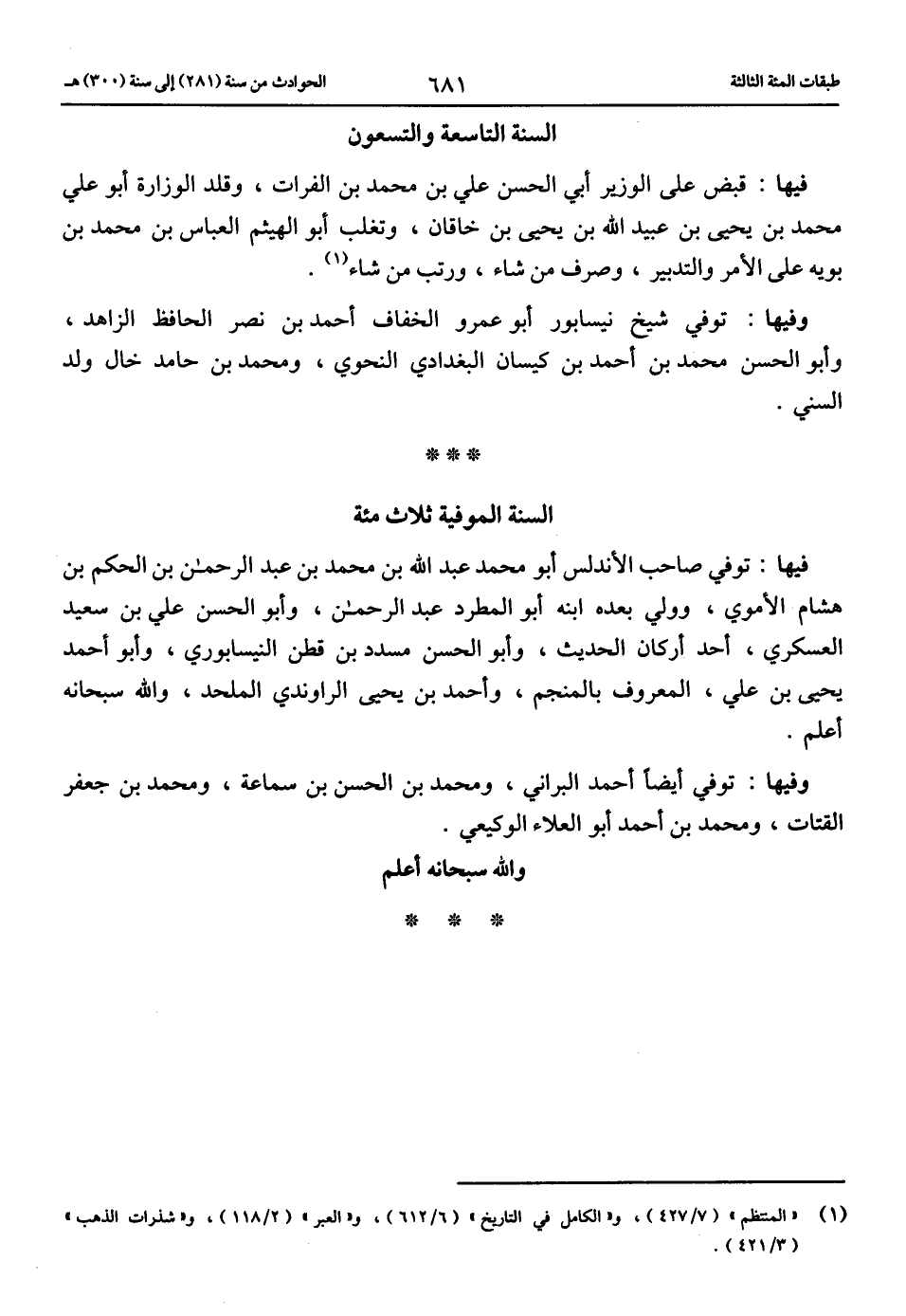 (1) «المنتظم» (7/ 427)، و «الكامل في التاريخ» (6/ 612)، و «العبر» (2/ 118)، و «شذرات الذهب» (3/ 421).