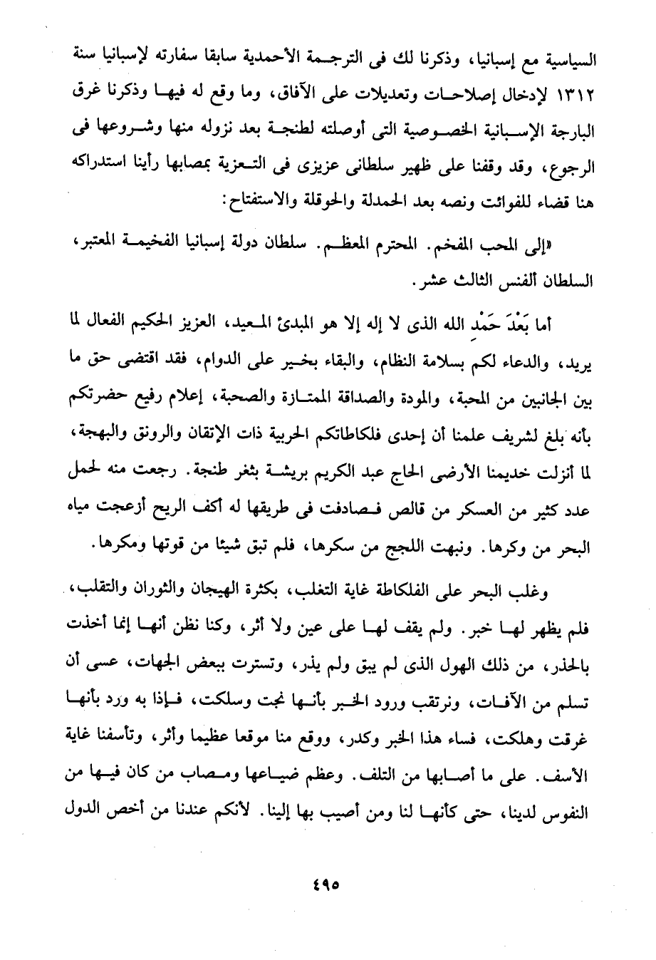 السياسية مع إسبانيا، وذكرنا لك في الترجمة الأحمدية سابقا سفارته لإسبانيا سنة 1312 لإدخال إصلاحات وتعديلات على الآفاق، وما وقع له فيها وذكرنا غرق البارجة الإسبانية الخصوصية التي أوصلته لطنجة بعد نزوله منها وشروعها في الرجوع، وقد وقفنا على ظهير سلطانى عزيزى في التعزية بمصابها رأينا استدراكه هنا قضاء للفوائت ونصه بعد الحمدلة والحوقلة والاستفتاح: