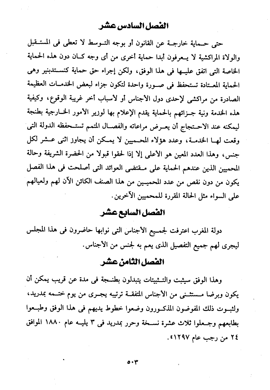 وهذا الوفق سيثبت والتثبيتات يتبدلون بطنجة في مدة عن قريب يمكن أن يكون وبرضا مستثنى من الأجناس المتفقة ترتيبه يجرى من يوم ختمه بمدريد، ولثبوت ذلك المفوضون المذكورون وضعوا خطوط يديهم في هذا الوفق وطبعوا بطابعهم وجعلوا ثلاث عشرة نسخة وحرر بمدريد في 3 يليه عام 1880 الموافق 24 من رجب عام 1297".