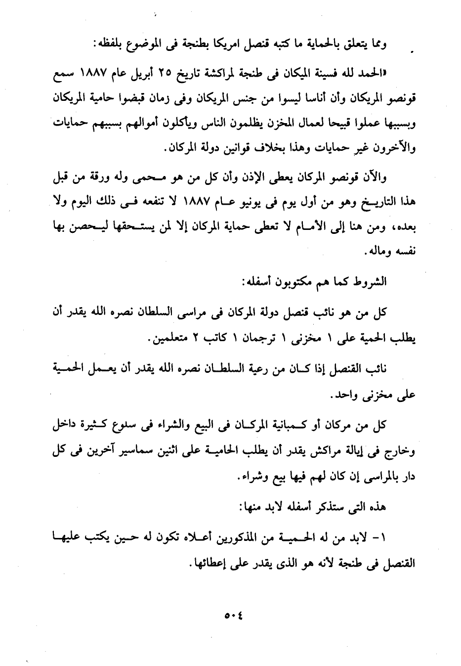 ومما يتعلق بالحماية ما كتبه قنصل امريكا بطنجة في الموضوع بلفظه: