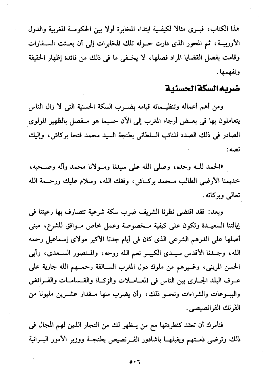 وبعد: فقد اقتضى نظرنا الشريف ضرب سكة شرعية تتصارف بها رعيتنا في إيالتنا السعيدة وتكون على كيفية مخصوصة وعمل خاص موافق للشرع، مبنى أصلها على الدرهم الشرعى الذى كان في أيام جدنا الأكبر مولاى إسماعيل رحمه الله، وجدنا الأقدس سيدى الكبير نعم الله روحه، والمنصور السعدى، وأبى الحسن المرينى، وغيرهم من ملوك دول المغرب السالفة رحمهم الله جارية على عرف البلد الجارى بين الناس في المعاملات والزكاة والقسامات والفرائض والبيوعات والشراءات ونحو ذلك، وأن يضرب منها مقدار عشرين مليونا من الفرنك الفرانصيصى.