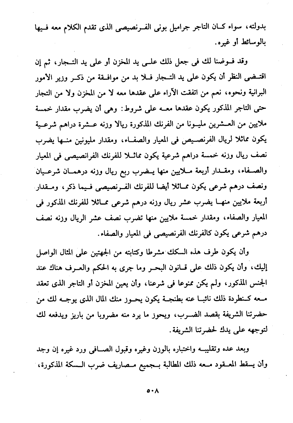 وقد فوضنا لك في جعل ذلك على يد المخزن أو على يد التجار، ثم إن اقتضى النظر أن يكون على يد التجار فلا بد من موافقة من ذكر وزير الأمور البرانية ونحوه، نعم من اتفقت الآراء على عقدها معه لا من المخزن ولا من التجار حتى التاجر المذكور يكون عقدها معه على شروط: وهى أن يضرب مقدار خمسة ملايين من العشرين مليونا من الفرنك المذكورة ريالا وزنه عشرة دراهم شرعية يكون مماثلا لريال الفرنصيص في المعيار والصفاء، ومقدار مليونين منها يضرب نصف ريال وزنه خمسة دراهم شرعية يكون مماثلا للفرنك الفرانصيصى في المعيار والصفاء، ومقدار أربعة ملايين منها يضرب ربع ريال وزنه درهمان شرعيان ونصف درهم شرعى يكون مماثلا أيضا للفرنك الفرنصيصى فيما ذكر، ومقدار أربعة ملايين منها يضرب عشر ريال وزنه درهم شرعى مماثلا للفرنك المذكور في المعيار والصفاء، ومقدار خمسة ملايين منها تضرب نصف عشر الريال وزنه نصف درهم شرعى يكون كالفرنك الفرنصيصى في المعيار والصفاء.