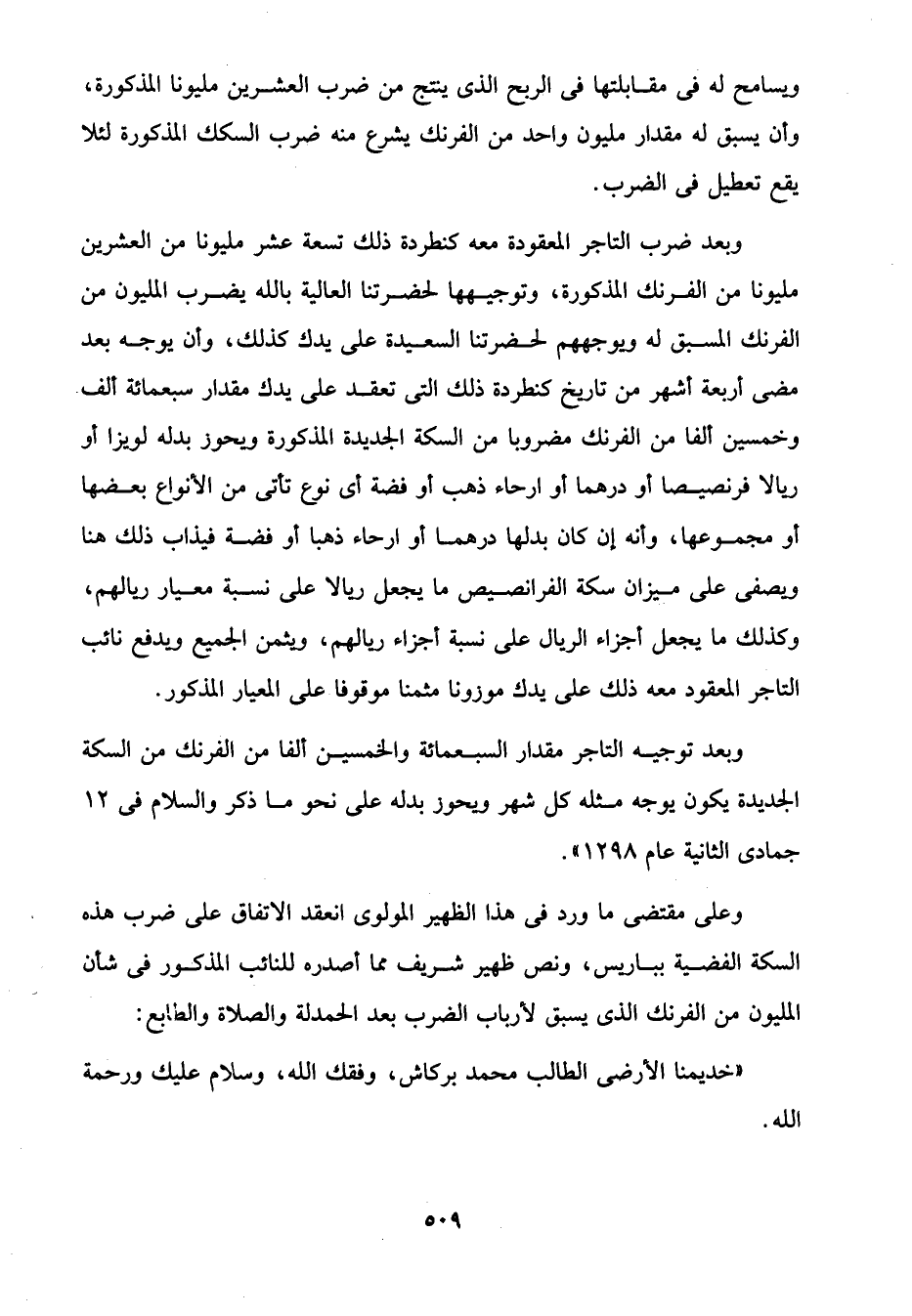 وعلى مقتضى ما ورد في هذا الظهير المولوى انعقد الاتفاق على ضرب هذه السكة الفضية بباريس، ونص ظهير شريف مما أصدره للنائب المذكور في شأن المليون من الفرنك الذى يسبق لأرباب الضرب بعد الحمدلة والصلاة والطابع: