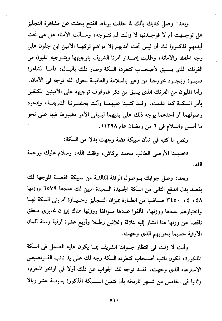 وبعد: وصل كتابك بأنك لما حللت برباط الفتح بحثت عن مشاهرة النجليز هل توجهت أم لا فوجدتها لا زالت لم تتوجه، وسألت الأمناء هل هى تحت أيديهم فذكروا لك أن ليس تحت أيديهم إلا دراهم تركها الأمين ابن جلون على وجه الحفظ والأمانة، وطلبت إصدار أمرنا الشريف بتوجيهها وبتوجيه المليون من الفرنك الذى يسبق لأصحاب كنطردة السكة وصار ذلك بالبال، فأما المشاهرة فميسرة وبمجرد خروجنا من زعير بالسلامة والعافية بحول الله توجه في الأمان. وأما المليون من الفرنك الذى يسبق لمن ذكر فموقوف توجيهه على الأمينين المكلفين بأمر السكة كما علمت، وقد كتبنا عليهما وأنت بحضرتنا الشريفة، وبمجرد وصولهما أو أحدهما يوجه ذلك على يديهما ليبقى الأمر مضبوطا فيها على نحو ما أسس والسلام في 6 من رمضان عام 1298".