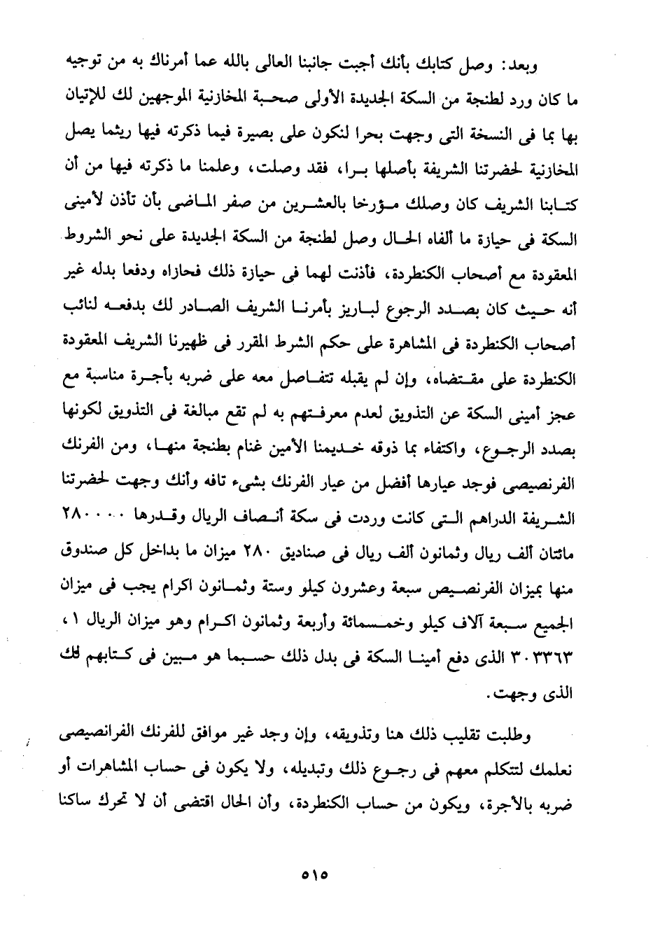 وبعد: وصل كتابك بأنك أجبت جانبنا العالى بالله عما أمرناك به من توجيه ما كان ورد لطنجة من السكة الجديدة الأولى صحبة المخازنية الموجهين لك للإتيان بها بما في النسخة التي وجهت بحرا لنكون على بصيرة فيما ذكرته فيها ريثما يصل المخازنية لحضرتنا الشريفة بأصلها برا، فقد وصلت، وعلمنا ما ذكرته فيها من أن كتابنا الشريف كان وصلك مؤرخا بالعشرين من صفر الماضى بأن تأذن لأمينى السكة في حيازة ما ألفاه الحال وصل لطنجة من السكة الجديدة على نحو الشروط المعقودة مع أصحاب الكنطردة، فأذنت لهما في حيازة ذلك فحازاه ودفعا بدله غير أنه حيث كان بصدد الرجوع لباريز بأمرنا الشريف الصادر لك بدفعه لنائب أصحاب الكنطردة في المشاهرة على حكم الشرط المقرر في ظهيرنا الشريف المعقودة الكنطردة على مقتضاه، وإن لم يقبله تتفاصل معه على ضربه بأجرة مناسبة مع عجز أمينى السكة عن التذويق لعدم معرفتهم به لم تقع مبالغة في التذويق لكونها بصدد الرجوع، واكتفاء بما ذوقه خديمنا الأمين غنام بطنجة منها، ومن الفرنك الفرنصيصى فوجد عيارها أفضل من عيار الفرنك بشئ تافه وأنك وجهت لحضرتنا الشريفة الدراهم التي كانت وردت في سكة أنصاف الريال وقدرها 28,0000 مائتان ألف ريال وثمانون ألف ريال في صناديق 280 ميزان ما بداخل كل صندوق منها بميزان الفرنصيص سبعة وعشرون كيلو وستة وثمانون اكرام يجب في ميزان الجميع سبعة آلاف كيلو وخمسمائة وأربعة وثمانون اكرام وهو ميزان الريال 1,303363 الذى دفع أمينا السكة في بدل ذلك حسبما هو مبين في كتابهم لك الذى وجهت.
