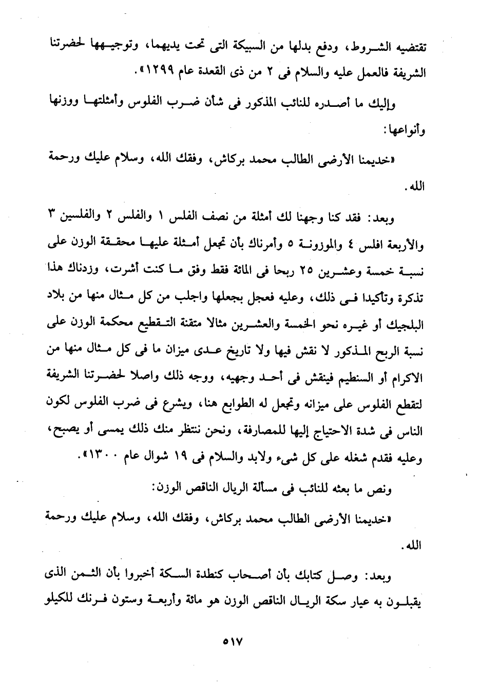 وبعد: فقد كنا وجهنا لك أمثلة من نصف الفلس 1 والفلس 2 والفلسين 3 والأربعة افلس 4 والموزونة 5 وأمرناك بأن تجعل أمثلة عليها محققة الوزن على نسبة خمسة وعشرين 25 ربحا في المائة فقط وفق ما كنت أشرت، وزدناك هذا تذكرة وتأكيدا في ذلك، وعليه فعجل بجعلها واجلب من كل مثال منها من بلاد البلجيك أو غيره نحو الخمسة والعشرين مثالا متقنة التقطيع محكمة الوزن على نسبة الربح المذكور لا نقش فيها ولا تاريخ عدى ميزان ما في كل مثال منها من الاكرام أو السنطيم فينقش في أحد وجهيه، ووجه ذلك واصلا لحضرتنا الشريفة لتقطع الفلوس على ميزانه وتجعل له الطوابع هنا، ويشرع في ضرب الفلوس لكون الناس في شدة الاحتياج إليها للمصارفة، ونحن ننتظر منك ذلك يمسى أو يصبح، وعليه فقدم شغله على كل شئ ولابد والسلام في 19 شوال عام 1300".