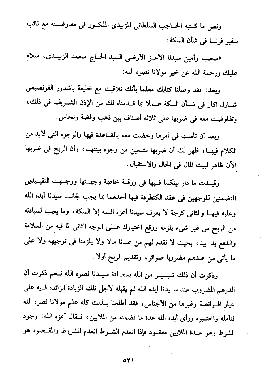 ونص ما كتبه الحاجب السلطانى للزبيدى المذكور في مفاوضته مع نائب سفير فرنسا في شأن السكة:
