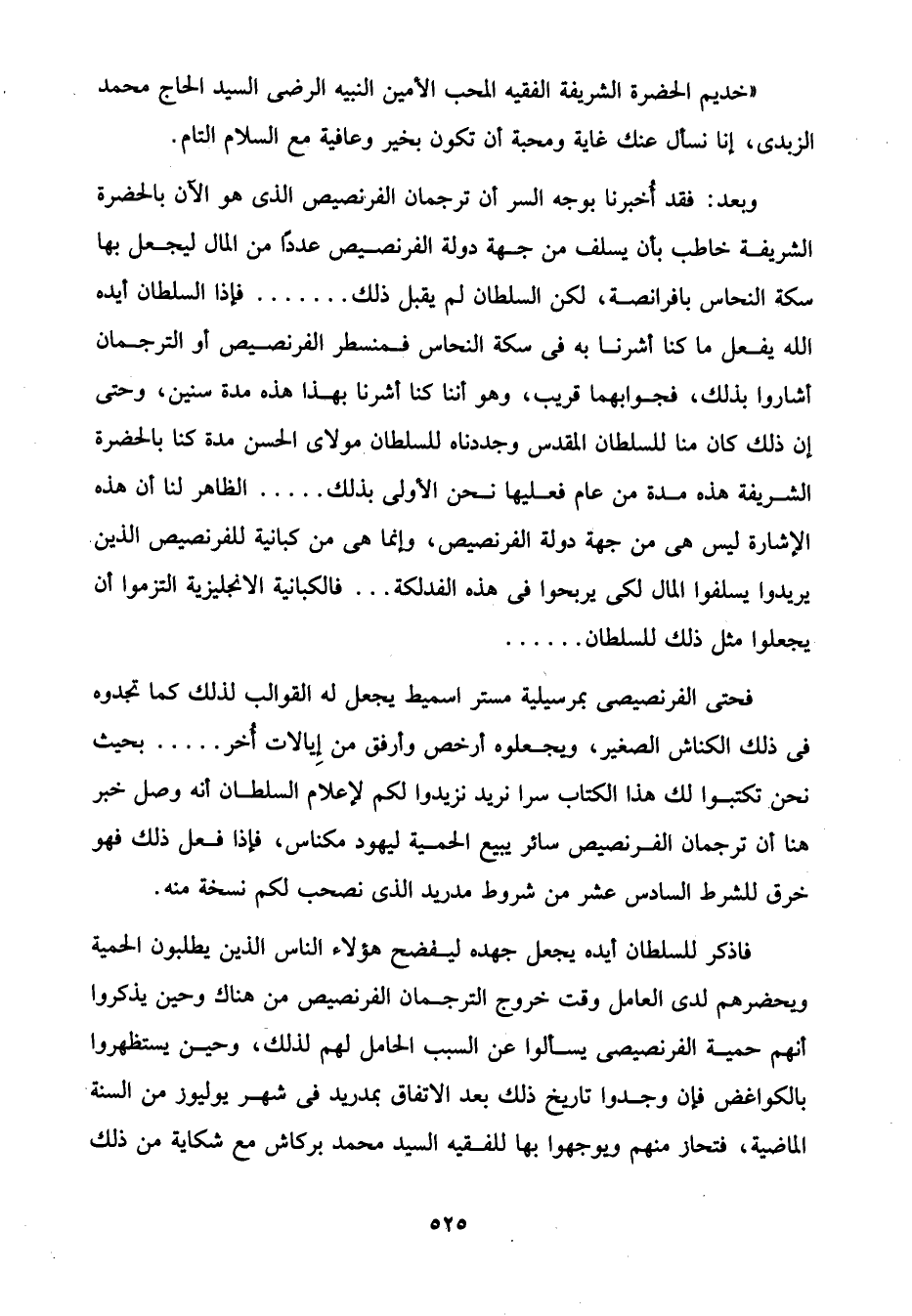 وبعد: فقد أُخبرنا بوجه السر أن ترجمان الفرنصيص الذى هو الآن بالحضرة الشريفة خاطب بأن يسلف من جهة دولة الفرنصيص عددًا من المال ليجعل بها سكة النحاس بافرانصة، لكن السلطان لم يقبل ذلك ... ... ، فإذا السلطان أيده الله يفعل ما كنا أشرنا به في سكة النحاس فمنسطر الفرنصيص أو الترجمان أشاروا بذلك، فجوابهما قريب، وهو أننا كنا أشرنا بهذا هذه مدة سنين، وحتى إن ذلك كان منا للسلطان المقدس وجددناه للسلطان مولاى الحسن مدة كنا بالحضرة الشريفة هذه مدة من عام فعليها نحن الأولى بذلك ... . . الظاهر لنا أن هذه الإشارة ليس هى من جهة دولة الفرنصيص، وإنما هى من كبانية للفرنصيص الذين يريدوا يسلفوا المال لكى يربحوا في هذه الفدلكة ... فالكبانية الانجليزية التزموا أن يجعلوا مثل ذلك للسلطان ... ...