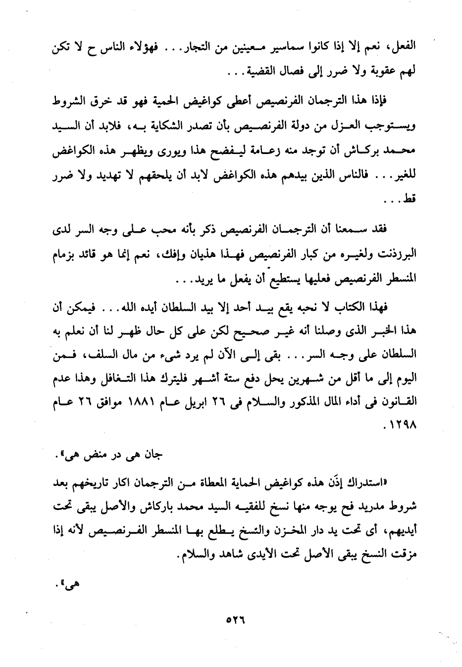 فإذا هذا الترجمان الفرنصيص أعطى كواغيض الحمية فهو قد خرق الشروط ويستوجب العزل من دولة الفرنصيص بأن تصدر الشكاية به، فلابد أن السيد محمد بركاش أن توجد منه زعامة ليفضح هذا ويورى ويظهر هذه الكواغض للغير ... فالناس الذين بيدهم هذه الكواغض لابد أن يلحقهم لا تهديد ولا ضرر قط ...