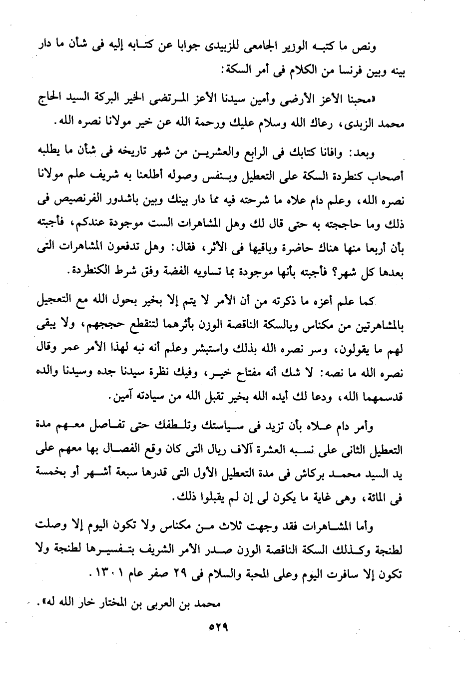 وأما المشاهرات فقد وجهت ثلاث من مكناس ولا تكون اليوم إلا وصلت لطنجة وكذلك السكة الناقصة الوزن صدر الأمر الشريف بتفسيرها لطنجة ولا تكون إلا سافرت اليوم وعلى المحبة والسلام في 29 صفر عام 1301.