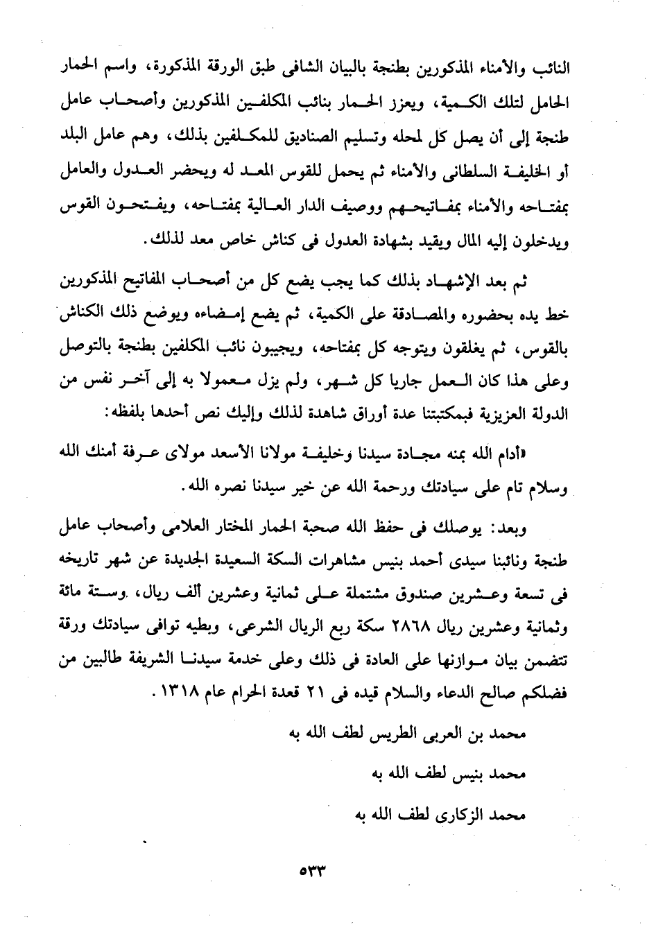 وبعد: يوصلك في حفظ الله صحبة الحمار المختار العلامى وأصحاب عامل طنجة ونائبنا سيدى أحمد بنيس مشاهرات السكة السعيدة الجديدة عن شهر تاريخه في تسعة وعشرين صندوق مشتملة على ثمانية وعشرين ألف ريال، وستة مائة وثمانية وعشرين ريال 2868 سكة ربع الريال الشرعى، وبطيه توافى سيادتك ورقة تتضمن بيان موازنها على العادة في ذلك وعلى خدمة سيدنا الشريفة طالبين من فضلكم صالح الدعاء والسلام قيده في 21 قعدة الحرام عام 1318.
