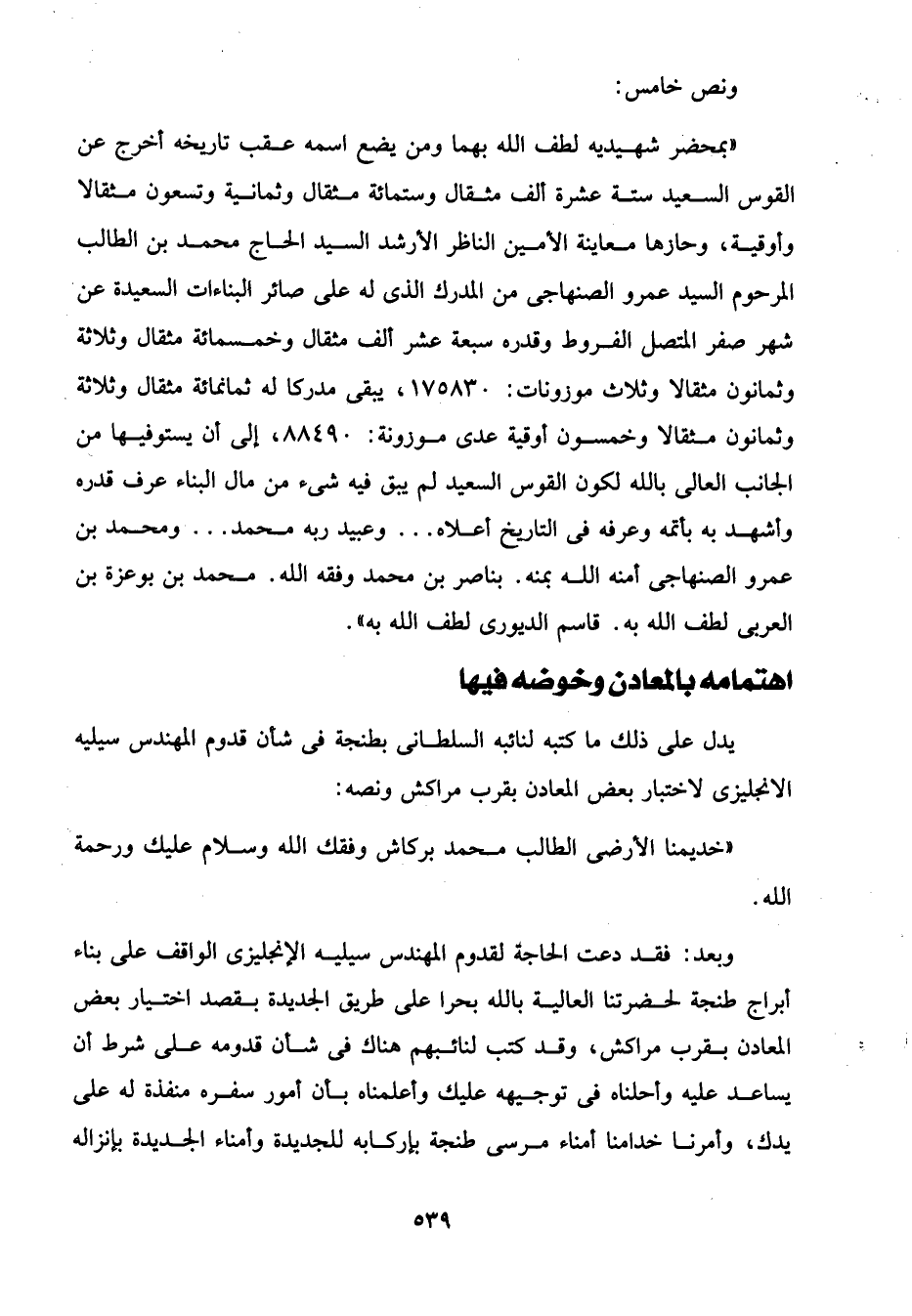 "بمحضر شهيديه لطف الله بهما ومن يضع اسمه عقب تاريخه أخرج عن القوس السعيد ستة عشرة ألف مثقال وستمائة مثقال وثمانية وتسعون مثقالا وأوقية، وحازها معاينة الأمين الناظر الأرشد السيد الحاج محمد بن الطالب المرحوم السيد عمرو الصنهاجى من المدرك الذى له على صائر البناءات السعيدة عن شهر صفر المتصل الفروط وقدره سبعة عشر ألف مثقال وخمسمائة مثقال وثلاثة وثمانون مثقالا وثلاث موزونات: 175830، يبقى مدركا له ثمانمائة مثقال وثلاثة وثمانون مثقالا وخمسون أوقية عدى موزونة: 88490، إلى أن يستوفيها من الجانب العالى بالله لكون القوس السعيد لم يبق فيه شئ من مال البناء عرف قدره وأشهد به بأتمه وعرفه في التاريخ أعلاه ... وعبيد ربه محمد ... ومحمد بن عمرو الصنهاجى أمنه الله بمنه. بناصر بن محمد وفقه الله. محمد بن بوعزة بن العربى لطف الله به. قاسم الديورى لطف الله به".