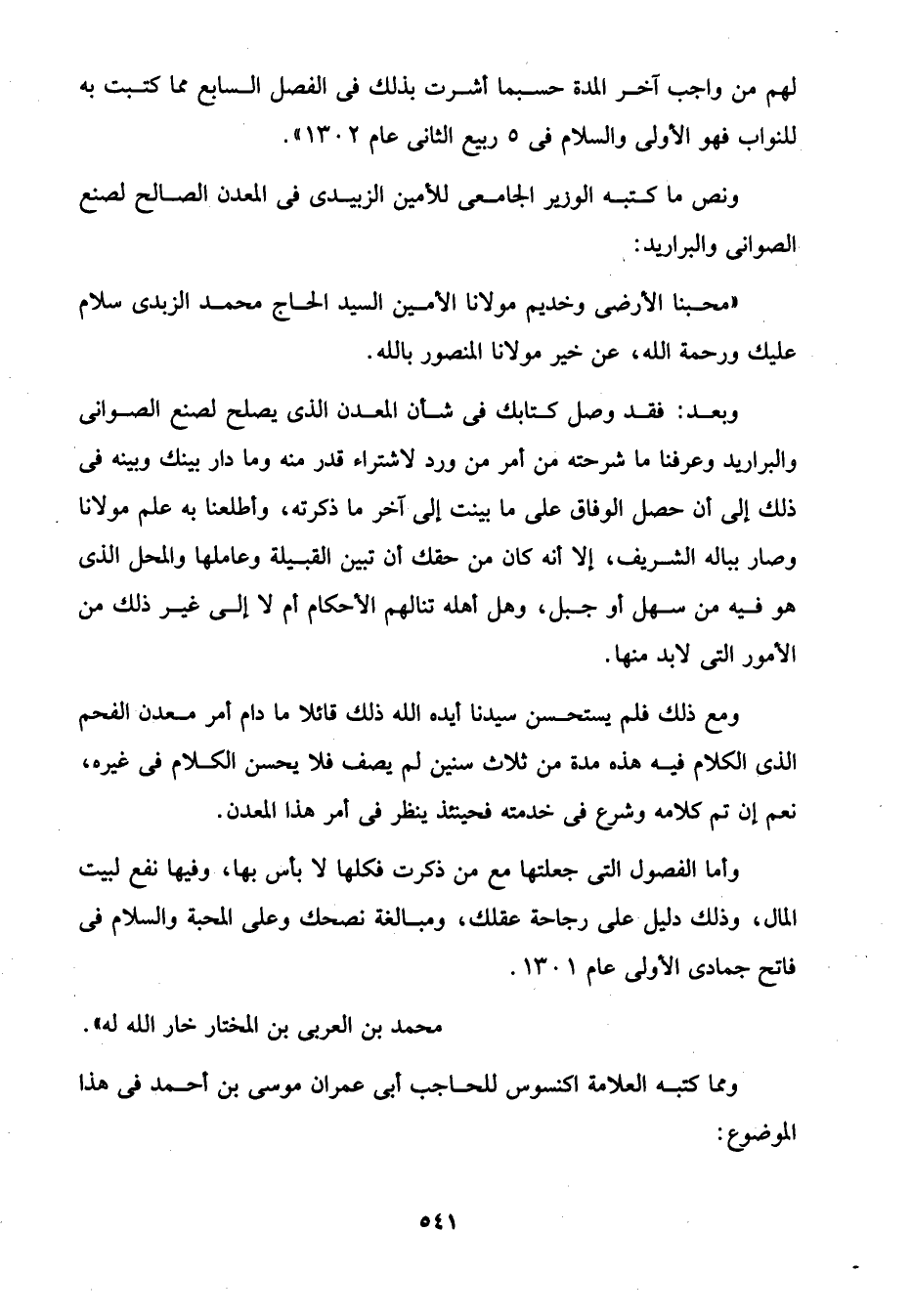 وبعد: فقد وصل كتابك في شأن المعدن الذى يصلح لصنع الصوانى والبراريد وعرفنا ما شرحته من أمر من ورد لاشتراء قدر منه وما دار بينك وبينه في ذلك إلى أن حصل الوفاق على ما بينت إلى آخر ما ذكرته، وأطلعنا به علم مولانا وصار بباله الشريف، إلا أنه كان من حقك أن تبين القبيلة وعاملها والمحل الذى هو فيه من سهل أو جبل، وهل أهله تنالهم الأحكام أم لا إلى غير ذلك من الأمور التي لابد منها.