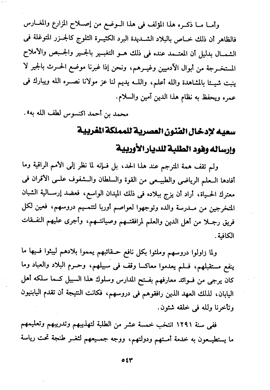 سعيه لإدخال الفنون العصرية للمملكة المغربية وإرساله وفود الطلبة للديار الأوربية