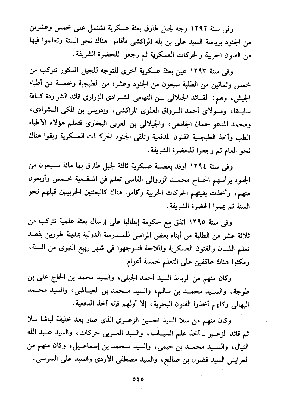 وفى سنة 1293 عين بعثة عسكرية أخرى للتوجه للجبل المذكور تتركب من خمس وثمانين من الطلبة سبعون من الجنود وعشرة من الطبجية وخمسة من أطباء الجيش، وهم: القائد الجيلالى بن التهامى الشرادى الزرارى قائد الشراردة كافة سابقا، ومولاى أحمد الزواق العلوى المراكشى، وإدريس بن المكى الشرادى، ومحمد المدعو حمان الجامعى، والجيلالى بن العربى البخارى فتعلم هؤلاء الأطباء الطب وأخذ الطبجية الفنون المدفعية وتلقى الجنود الحركات العسكرية وبقوا هناك نحو العام ثم رجعوا للحضرة الشريفة.