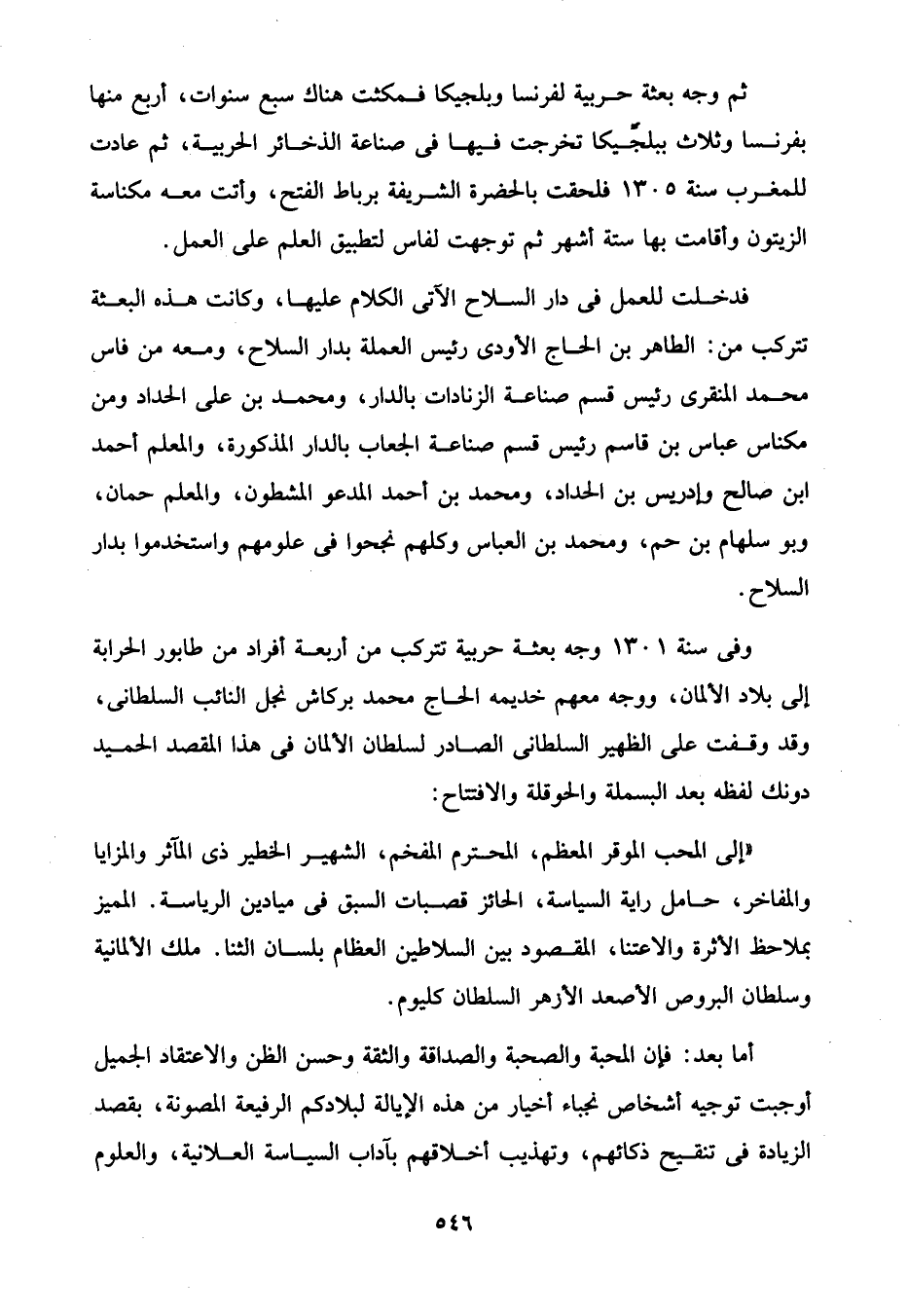 فدخلت للعمل في دار السلاح الآتى الكلام عليها، وكانت هذه البعثة تتركب من: الطاهر بن الحاج الأودى رئيس العملة بدار السلاح، ومعه من فاس محمد المنقرى رئيس قسم صناعة الزنادات بالدار، ومحمد بن على الحداد ومن مكناس عباس بن قاسم رئيس قسم صناعة الجعاب بالدار المذكورة، والمعلم أحمد ابن صالح وإدريس بن الحداد، ومحمد بن أحمد المدعو المشطون، والمعلم حمان، وبو سلهام بن حم، ومحمد بن العباس وكلهم نجحوا في علومهم واستخدموا بدار السلاح.