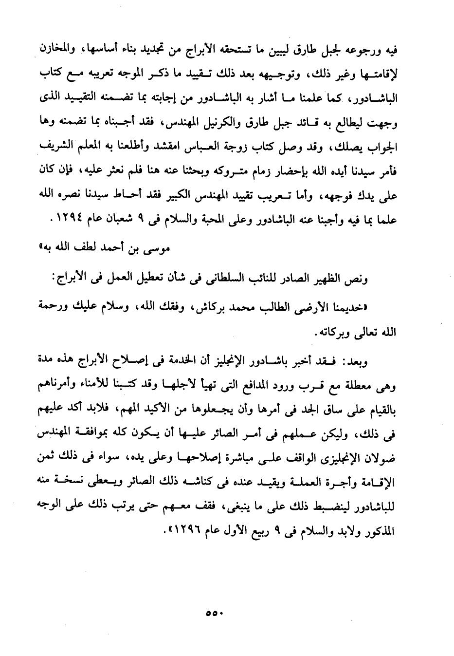 فيه ورجوعه لجبل طارق ليبين ما تستحقه الأبراج من تجديد بناء أساسها، والمخارن لإقامتها وغير ذلك، وتوجيهه بعد ذلك تقييد ما ذكر الموجه تعريبه مع كتاب الباشادور، كما علمنا ما أشار به الباشادور من إجابته بما تضمنه التقييد الذى وجهت ليطالع به قائد جبل طارق والكرنيل المهندس، فقد أجبناه بما تضمنه وها الجواب يصلك، وقد وصل كتاب زوجة العباس امقشد وأطلعنا به المعلم الشريف فأمر سيدنا أيده الله بإحضار زمام متروكه وبحثنا عنه هنا فلم نعثر عليه، فإن كان على يدك فوجهه، وأما تعريب تقييد المهندس الكبير فقد أحاط سيدنا نصره الله علما بما فيه وأجبنا عنه الباشادور وعلى المحبة والسلام في 9 شعبان عام 1294.