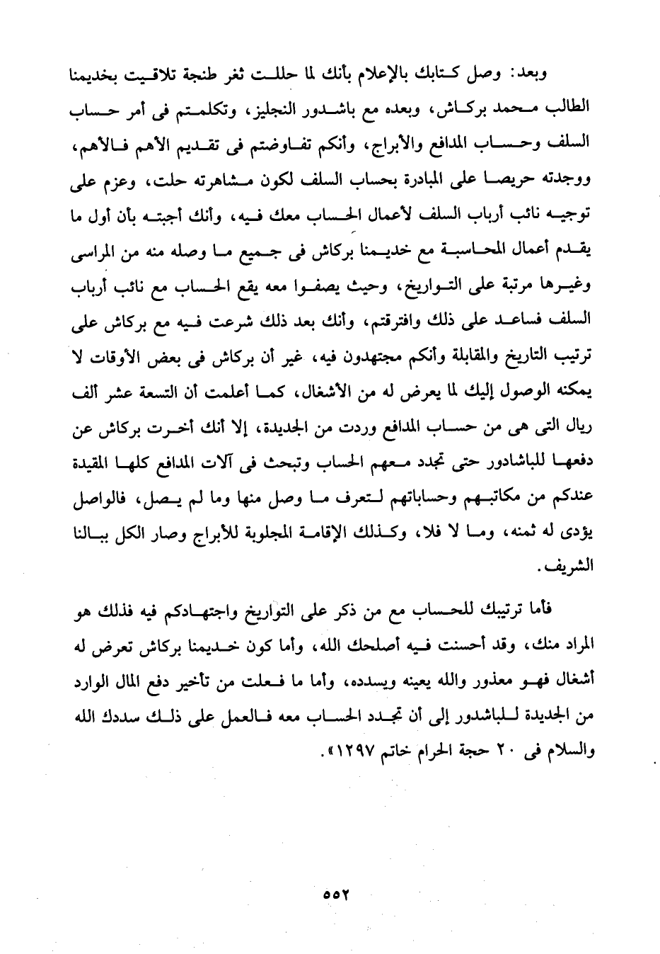 فأما ترتيبك للحساب مع من ذكر على التواريخ واجتهادكم فيه فذلك هو المراد منك، وقد أحسنت فيه أصلحك الله، وأما كون خديمنا بركاش تعرض له أشغال فهو معذور والله يعينه ويسدده، وأما ما فعلت من تأخير دفع المال الوارد من الجديدة للباشدور إلى أن تجدد الحساب معه فالعمل على ذلك سددك الله والسلام في 20 حجة الحرام خاتم 1297".